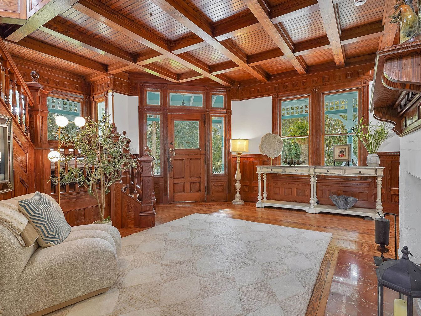 Warm wooden craftsmanship dominates this inviting entryway and staircase area, featuring intricate wood-paneled walls and coffered ceilings. The space showcases a classic yet cozy style, blending timeless architectural details with family-friendly comfort. A plush sofa with textured pillows offers a welcoming spot for guests, enhanced by a soft, neutral-toned area rug ideal for children to play. Soft natural light pours in through large windows framed by decorative trim, while a sturdy white console table provides functional display and storage space. Thoughtful greenery and elegant lighting create an atmosphere of warmth, making it a perfect transitional space for busy households.