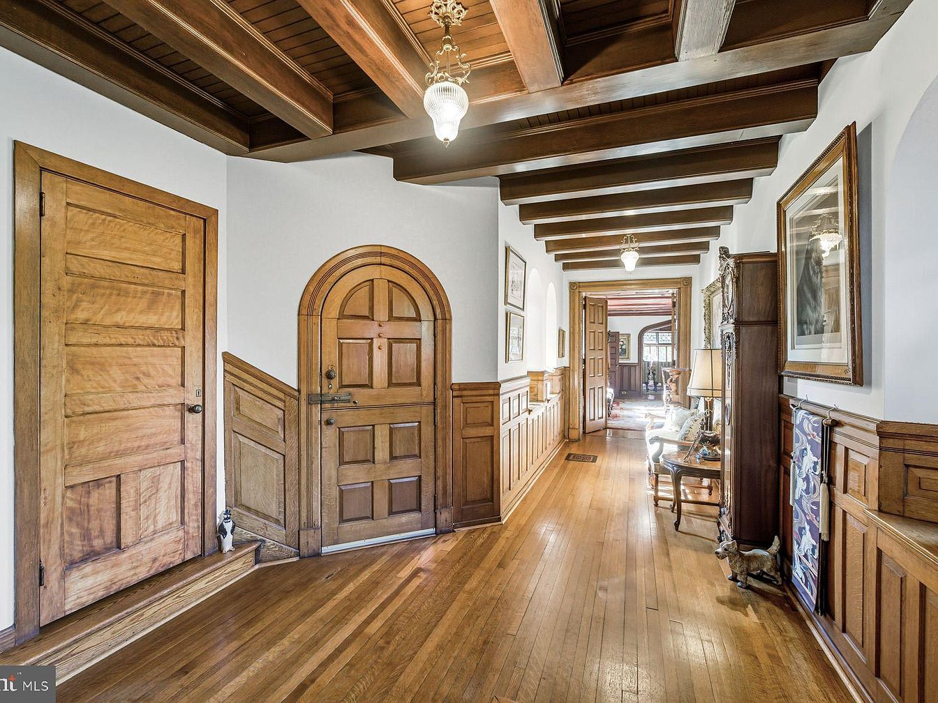 A spacious hallway greets visitors with rich, stained woodwork and beautiful craftsmanship throughout. The arched doorway and matching classic paneled doors add a unique architectural flair, while exposed wood ceiling beams create a sense of warmth and character. Crisp white walls contrast with honey-toned hardwood floors, enhancing the open, inviting atmosphere. Ample wall space allows for the display of family photos and artwork, and there’s room for a bench or coat rack for everyday functionality. The layout flows naturally toward the living spaces, making this hall both practical for families and perfect for welcoming guests.