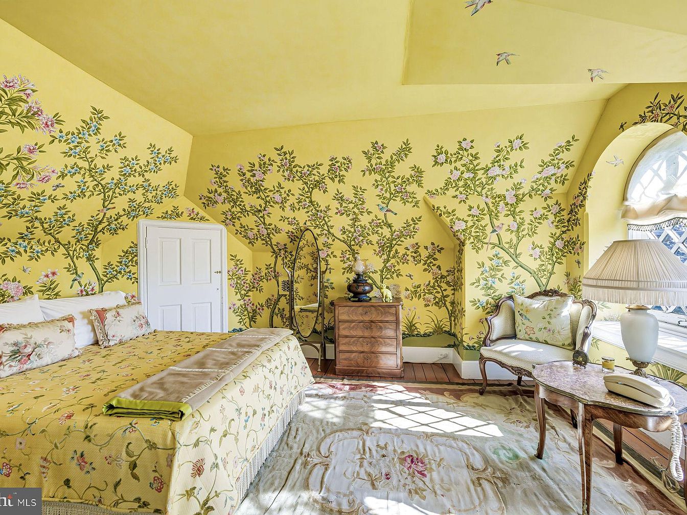 A sun-filled bedroom adorned with hand-painted botanical murals that create a tranquil and cheerful setting, complemented by soft yellow tones throughout. The spacious layout includes a cozy king-sized bed dressed in floral linens, a classic wooden dresser, and a delicate upholstered loveseat by an arched window. Natural light enhances the airy, welcoming ambiance, making this space both inviting and suitable for family comfort. Carefully selected vintage furniture and an ornate area rug add timeless charm, while playful touches like birds on the ceiling inspire a sense of whimsy and wonder for family members of all ages.