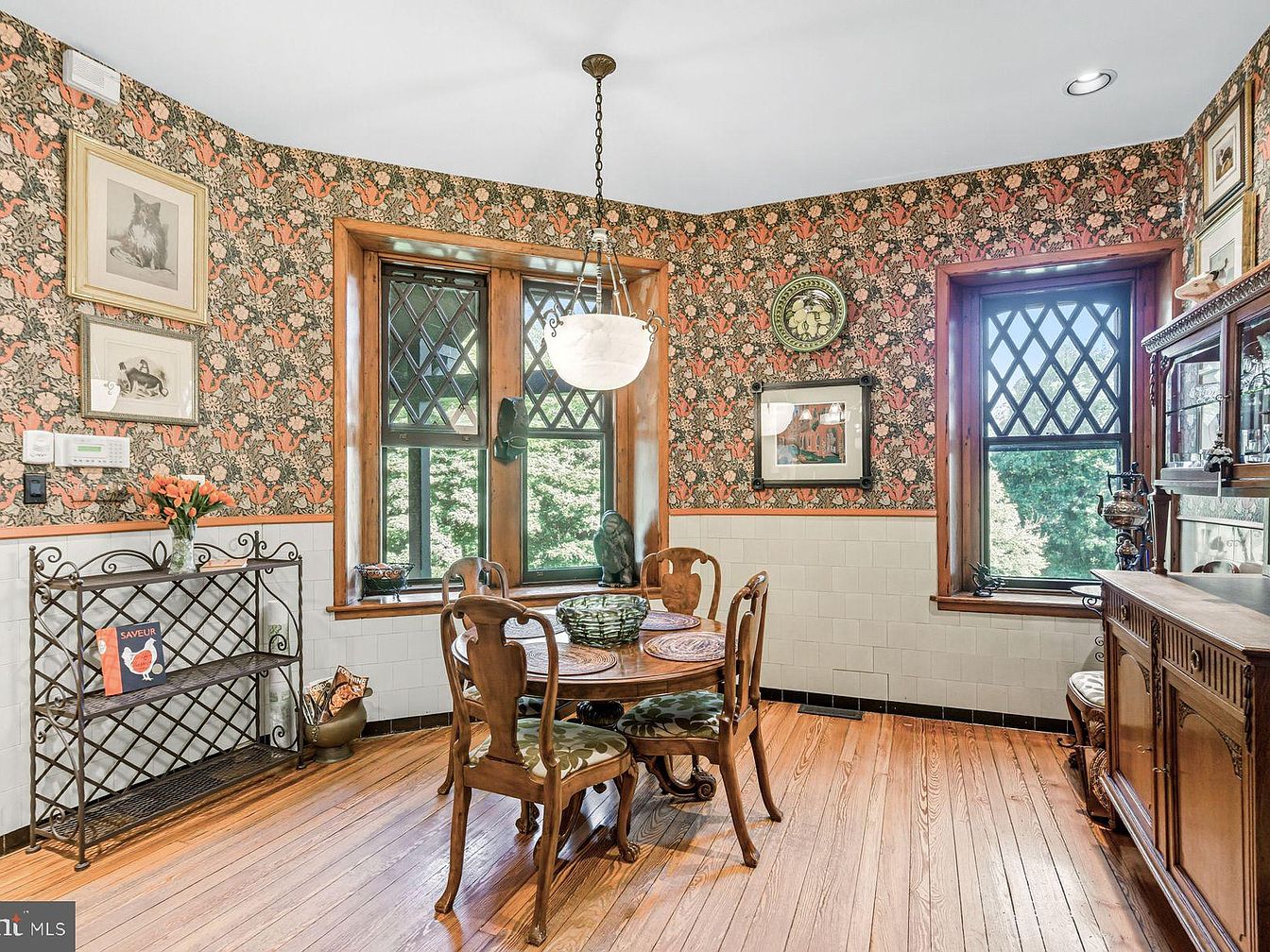 This charming dining nook features a blend of vintage elegance and cozy comfort, making it ideal for family meals and intimate gatherings. The walls pair striking floral wallpaper with classic white tiling, creating a warm and inviting atmosphere. Natural light pours in through large, grid-paned wood-framed windows that offer picturesque outdoor views. A wooden dining set with intricately carved chairs anchors the space, accompanied by a matching buffet and wrought iron shelving for added storage. Framed artwork and a globe pendant light add unique character, while the hardwood floors provide durability and a family-friendly surface for daily activity.