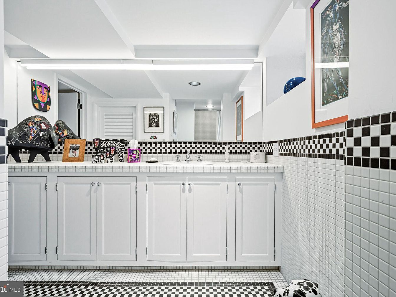 A stylish and vibrant bathroom vanity showcases a fresh, contemporary look with its striking black and white tiled walls and floor. The expansive countertop is topped with crisp white cabinetry that offers ample storage, making the space family-friendly by keeping toiletries and essentials neatly tucked away. Artistic decorations and playful, colorful framed art inject personality and warmth, creating a welcoming and imaginative atmosphere. A large mirror reflects light throughout the room, enhancing the sense of space. The monochrome palette is dotted with bright accents, giving the room a lively and customized feel suitable for all ages.