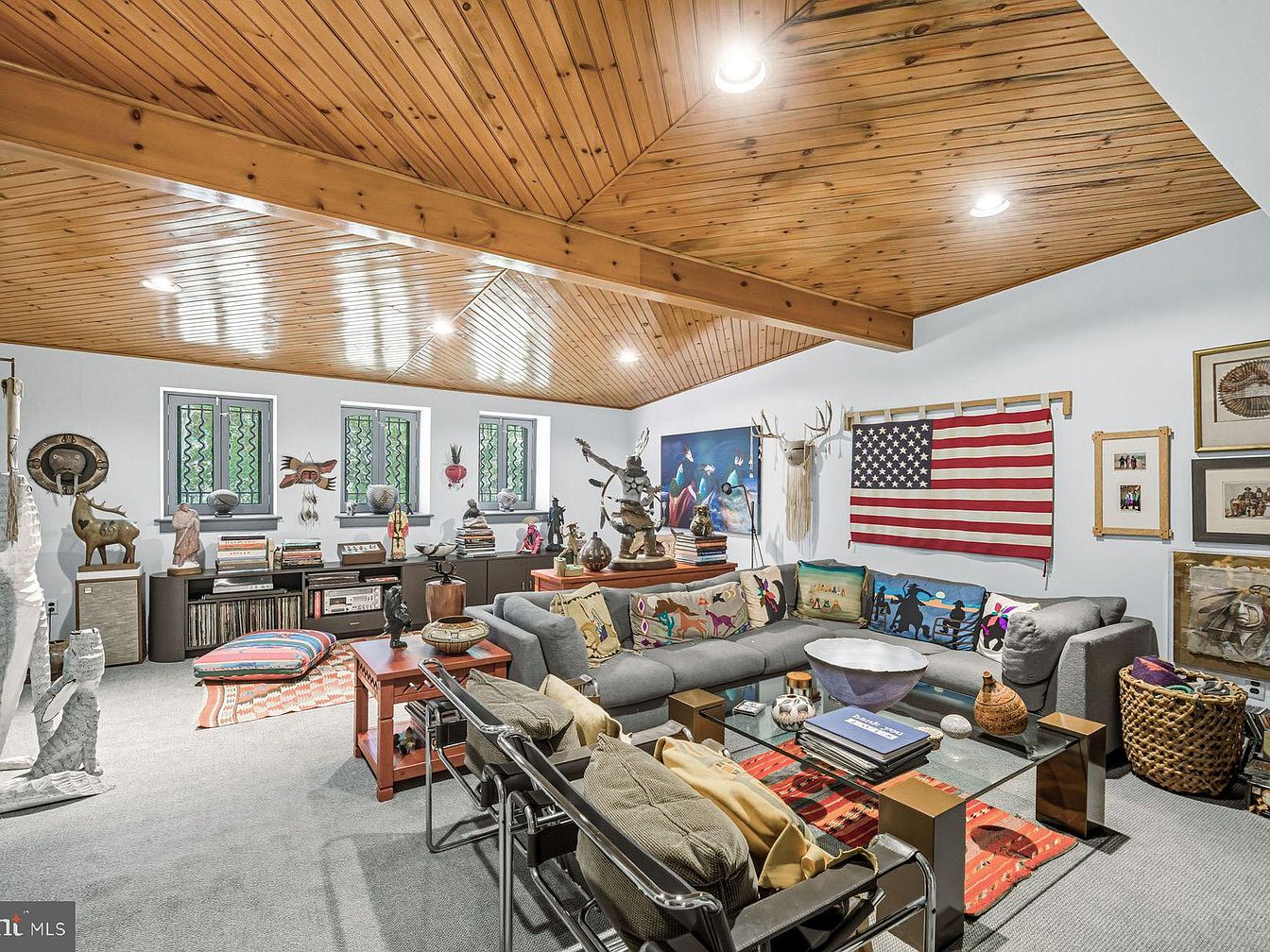 Warm and inviting, this recreation room blends modern comfort with rustic charm, featuring a stunning wood-paneled ceiling and subtle recessed lighting. The spacious layout centers around a roomy sectional sofa adorned with vibrant, themed throw pillows, perfect for family gatherings and movie nights. The walls are decorated with unique artwork, an American flag, and framed family photos, creating a personalized touch. Multiple windows bring in natural light, highlighting collections of sculptures and books along built-in storage units. Neutral carpet and colorful accent pieces, including rugs and poufs, make the space both stylish and child-friendly for play or relaxation.