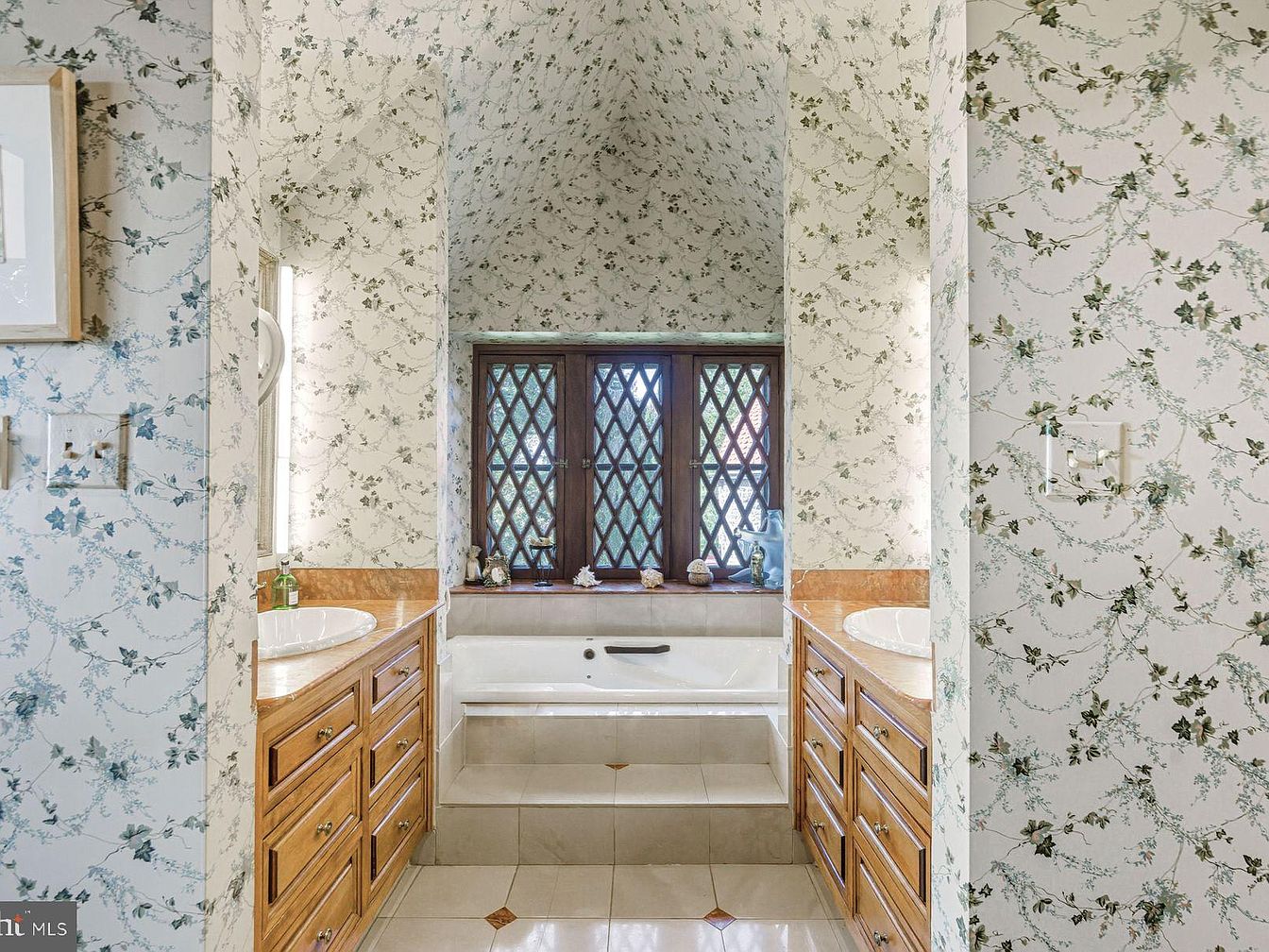 A charming bathtub alcove framed by dual wooden vanities and highlighted by a vaulted ceiling brings both elegance and comfort to this bathroom. Floral wallpaper wraps every surface, creating a cohesive and calming garden-inspired retreat. The warm wood cabinetry offers generous storage on both sides, making it perfect for families with ample essentials. Natural light filters gently through double lattice windows, adding a cozy and private atmosphere. Ornamental items on the windowsill add a personal touch, while the neutral tile floor grounds the space in classic refinement, making it both practical and aesthetically pleasing for daily family use.