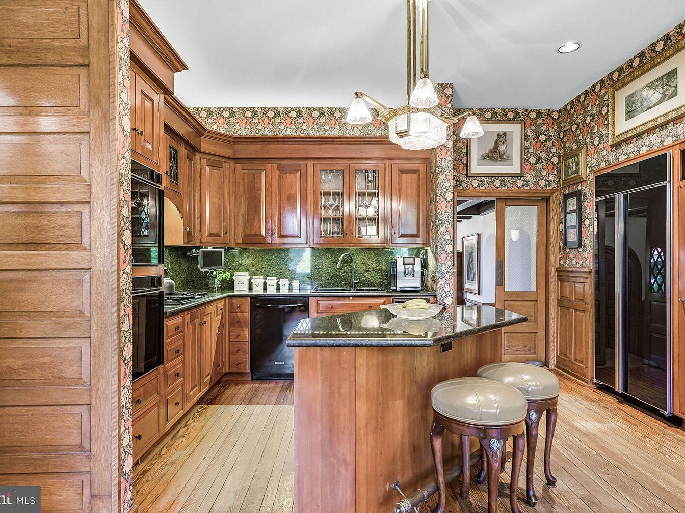 This warm and inviting kitchen blends traditional charm with practicality, featuring rich wooden cabinetry and a central island topped with gleaming dark granite. The layout maximizes space for family gatherings, providing two upholstered stools for casual seating and ample counter space for meal prep or homework. Elegant pendant lighting creates a welcoming ambiance, while the floral wallpaper and wood trim add vintage character. Glass-front cabinets offer a stylish way to display dishes, and built-in appliances are seamlessly integrated. Details such as labeled canisters and framed art contribute to a lived-in, family-friendly atmosphere ideal for everyday living.