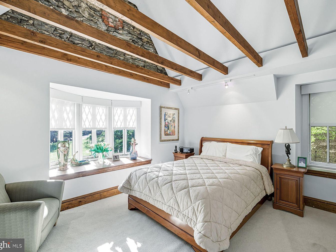 This inviting primary bedroom blends rustic charm with modern comfort, featuring exposed wood beams across a vaulted white ceiling and a striking stone accent wall. Natural light floods the space through a large bay window with diamond-patterned panes, creating the perfect nook for relaxing or displaying family treasures. The soft neutral color palette, warm wooden furniture, and plush carpeting exude coziness while providing a serene environment ideal for restful nights. A comfortable armchair offers extra seating, and the bedside tables provide storage for personal essentials, making the room both family-friendly and sophisticated for everyday living.