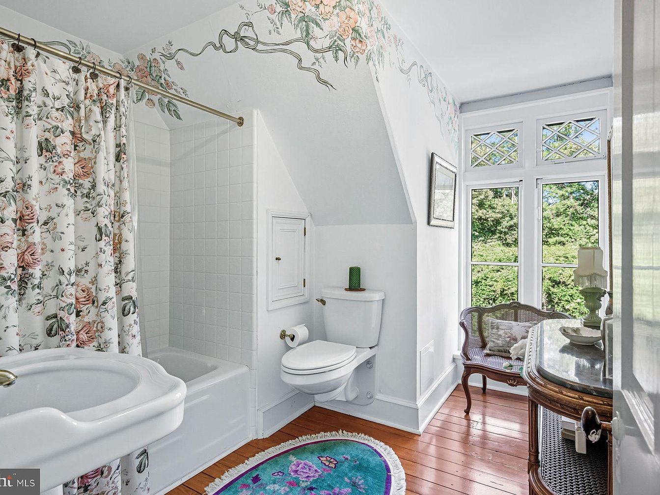 This beautifully designed bathroom combines vintage elegance with modern comfort, featuring a classic pedestal sink and a deep soaking tub complemented by a floral shower curtain. Soft pastel hues and delicate floral patterns continue on the hand-painted wall mural, enhancing the cozy, inviting atmosphere. Natural light floods the space through large, decorative windows, illuminating the rich wood floors and highlighting period details, such as the brass fixtures and an antique vanity. A plush, colorful rug adds a fun, family-friendly touch, while a small settee near the window offers a relaxing spot, making this bathroom perfect for families seeking charm and functionality.