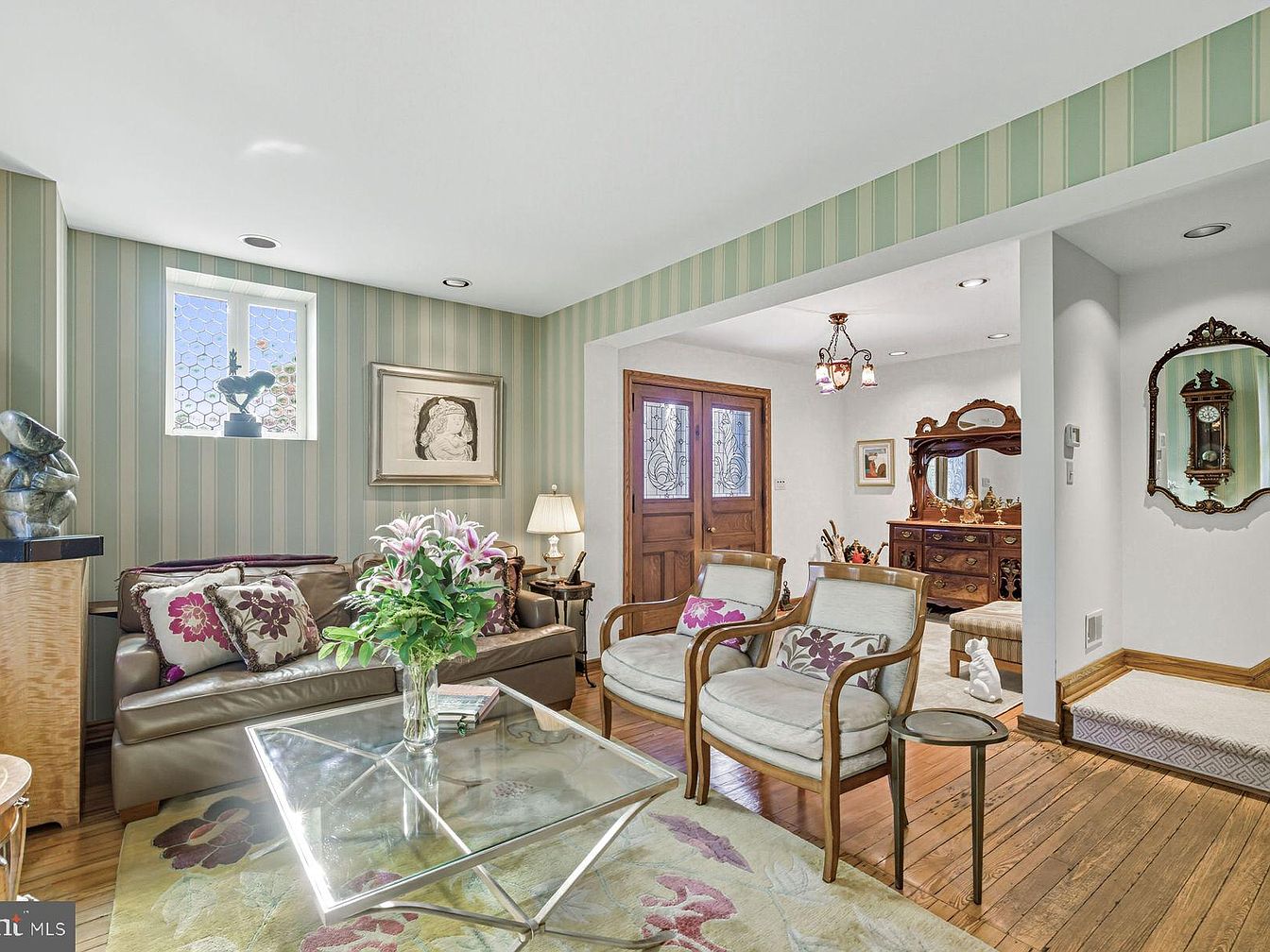 A welcoming living room featuring a blend of classic and contemporary decor greets guests as they enter the home. Natural light pours in through a decorative window, highlighting soft green striped wallpaper and warm wood flooring. The seating area includes a plush leather sofa and two comfortable armchairs, all adorned with floral accent pillows. A glass-top coffee table sits atop a floral-patterned rug, and fresh flowers add a lively touch. The space seamlessly connects to an inviting entry hall with stained glass double doors and a beautiful antique dresser, creating a family-friendly atmosphere perfect for gatherings and relaxation.