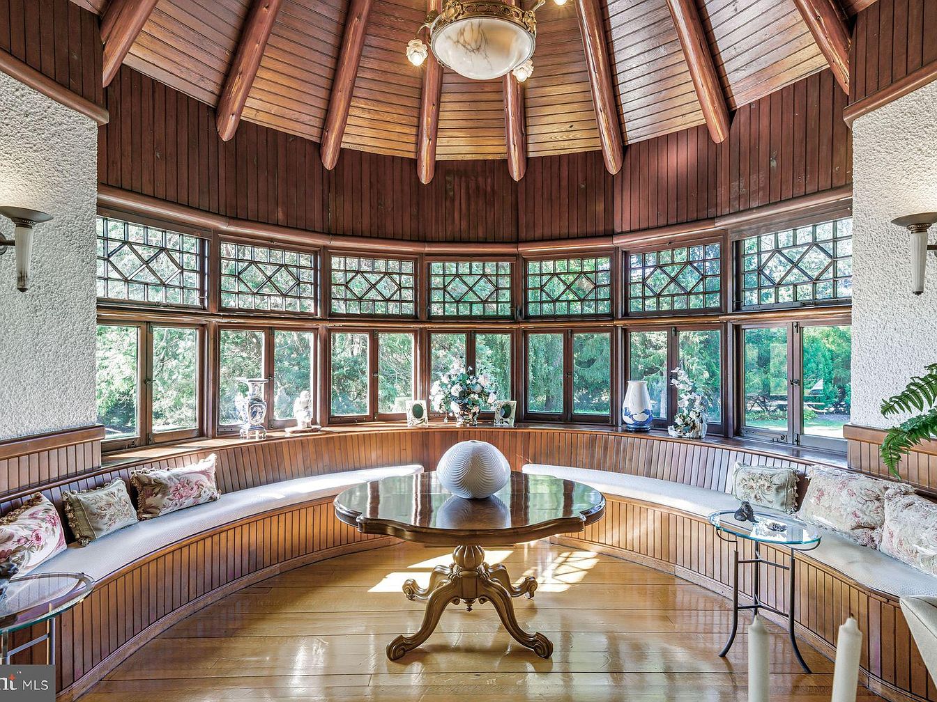 A stunning sunroom features a dramatic circular layout with a beautiful wooden vaulted ceiling and exposed beams, creating a warm and inviting atmosphere. Large wraparound windows fill the space with natural light and offer panoramic garden views, while decorative window panes add charm. A curved built-in bench offers ample seating, perfect for family gatherings or casual relaxation, accented with floral and botanical pillows for a cozy touch. The polished hardwood floor gleams beneath a classic round table centered in the room, making the area ideal for conversation, board games, or enjoying a sunny afternoon together as a family.