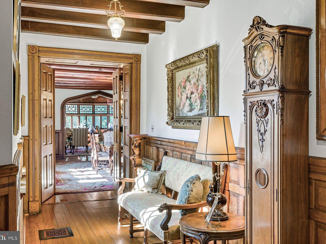 Warm natural wood tones define this elegant hallway, featuring polished wood floors and rich wainscoting. Exposed ceiling beams add architectural interest while a classic grandfather clock and antique-style settee with floral upholstery create an inviting, timeless ambiance. A framed floral painting and a sculptural lamp on a round side table enhance the traditional aesthetic. The open double doors lead to a sunlit parlor, revealing intricate wall trim and stained glass-style windows perfect for family gatherings. The spacious layout welcomes movement, making the area both visually stunning and functional for daily family life or entertaining guests.