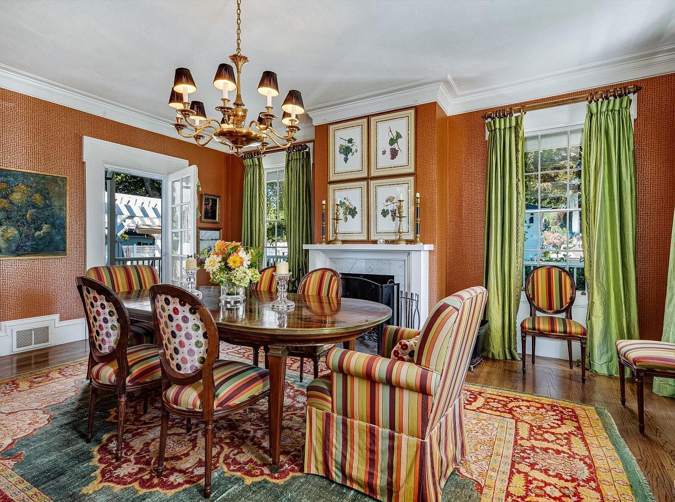 A beautifully designed dining room exuding warmth and sophistication. The rich orange wall is complemented by elegant green drapes, creating a vibrant yet cozy atmosphere. A round wooden table sits in the center, surrounded by tastefully upholstered chairs featuring colorful stripes and polka dots, encouraging lively family gatherings. A stunning chandelier hangs above, providing soft lighting, while framed botanical prints add a touch of nature and charm. The gleaming hardwood floors reflect the hues of a detailed area rug, enhancing the inviting vibe. Large windows bring in natural light, making this space perfect for both everyday meals and special occasions.