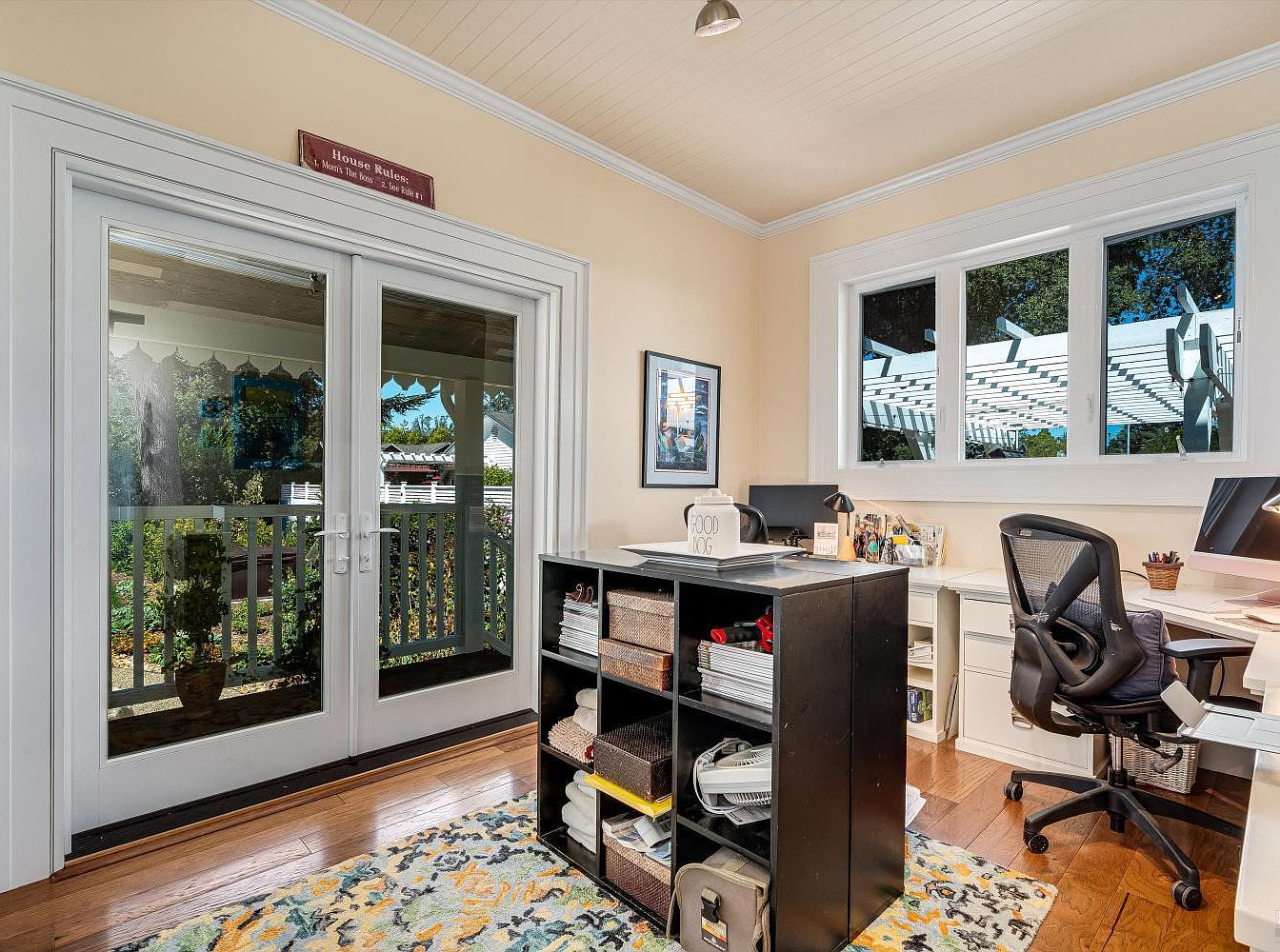This inviting home office combines functionality and comfort, perfect for both work and relaxation. The open layout features a stylish black storage unit that organizes supplies while contrasting beautifully with the warm wood flooring. Large French doors allow natural light to flood the room, enhancing the serene atmosphere and connecting to the landscaped outdoor area. A subtle color palette of soft neutrals complements the decor, while vibrant accents from the area rug add personality. The ergonomic chair promotes productivity, making this office a great space for creative pursuits or remote work, ideal for families balancing life and career.
