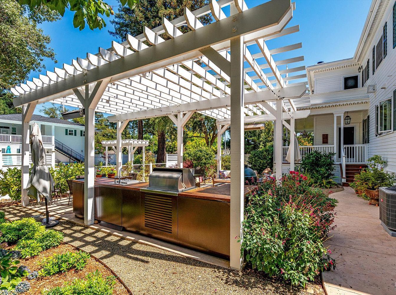 This inviting outdoor kitchen space features a sleek stainless steel grill and ample countertop for food preparation, framed by a charming pergola that provides shade while allowing natural light. The design blends functionality with aesthetics, creating an ideal setting for family gatherings. Surrounding lush greenery and colorful flower beds enhance the area’s warmth and intimacy, making it perfect for alfresco dining or casual barbecues. The neutral tones of the cabinetry complement the organic palette, while the gravel pathway adds a rustic touch, inviting guests to explore the surroundings. This space embodies the spirit of outdoor living.
