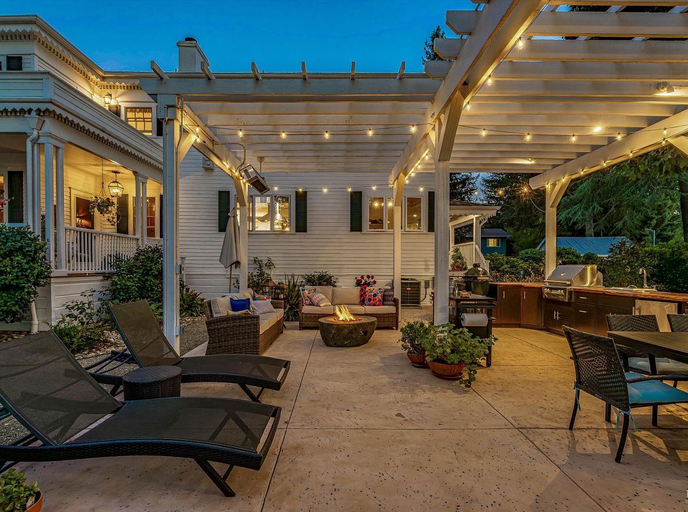 This inviting outdoor patio area features a cozy and functional layout designed for relaxation and entertainment. A charming pergola adorned with string lights creates an enchanting ambiance for evening gatherings. Comfortable rattan seating, accented with vibrant cushions, encircles a striking fire pit, fostering warmth and conversation among family and friends. The adjacent outdoor kitchen, equipped with a grill and ample counter space, encourages al fresco dining and culinary creativity. Lush greenery and potted plants enhance the aesthetic appeal, while the neutral color palette of the patio flooring harmonizes with the home’s classic architectural details.