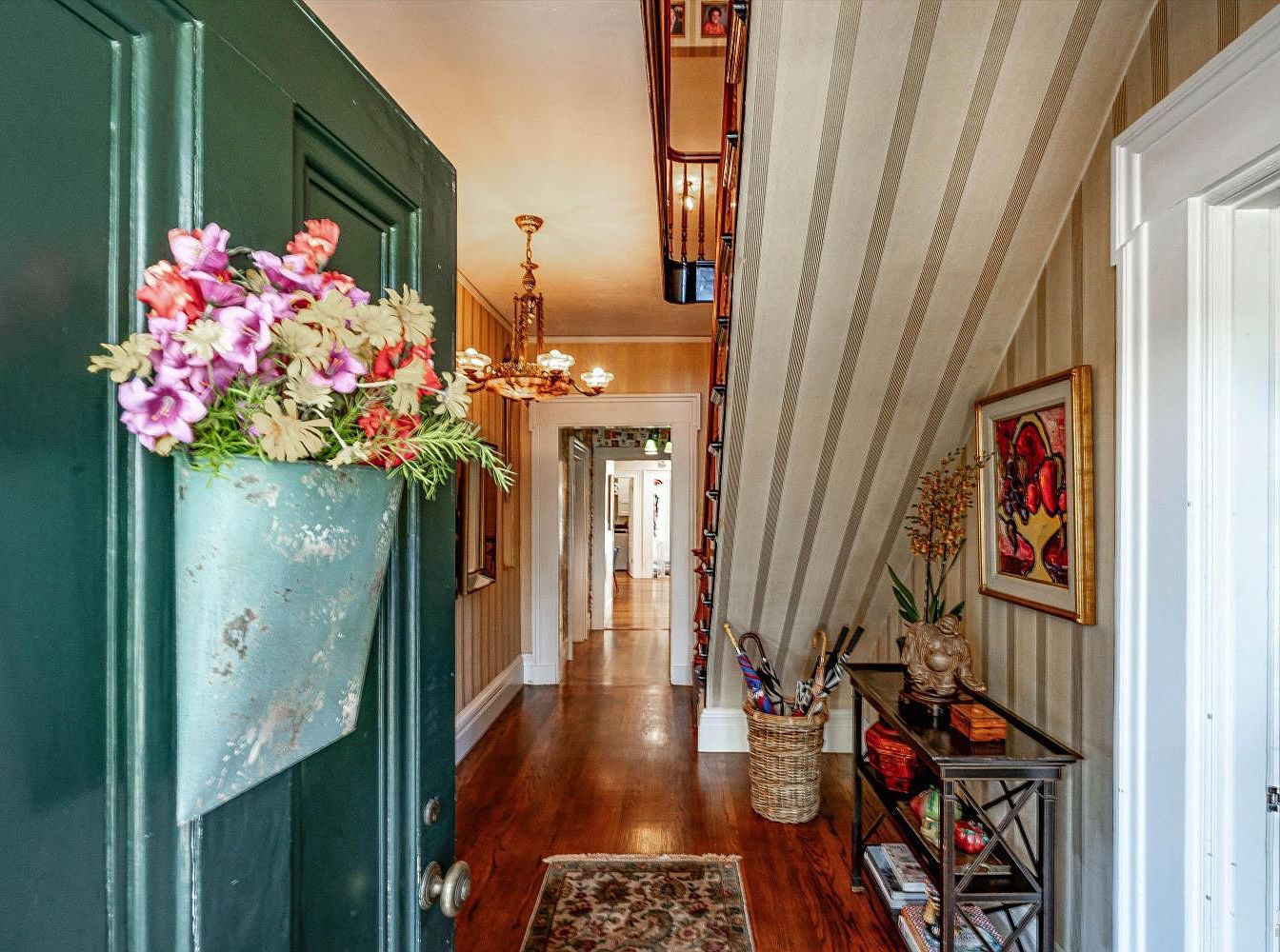 This inviting entryway combines warmth and style, showcasing a deep green front door adorned with vibrant, seasonal flowers in a vintage metal planter. The hardwood floors gleam under the soft glow of an ornate chandelier that introduces a touch of elegance. Vertical striped wallpaper in subtle hues flows up the staircase, leading to the upper levels of the home. A narrow console table adds functionality with a mix of decorative objects and a woven basket for practical storage. With its open layout and thoughtful decor, this space effortlessly welcomes guests into the heart of a family-friendly home.