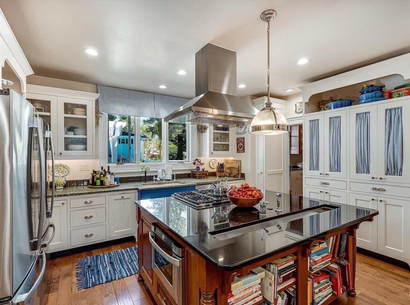 This kitchen features a spacious layout, characterized by elegant white cabinetry and a striking dark granite countertop that anchors the central island. A large window floods the area with natural light, offering a view of the lush outdoors, while sleek stainless steel appliances add a modern touch. The island serves not just as a prep space but also as a casual dining spot, emphasizing its family-friendly appeal. Warm wood flooring complements the light cabinetry, and the rustic charm is enhanced by decorative elements like cookbooks and vibrant dishware. Thoughtful details, including pendant lighting and a cozy rug, harmonize comfort with style.