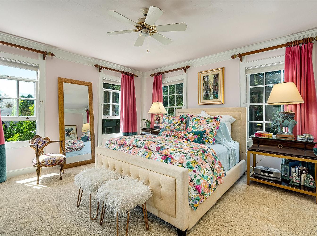 This master bedroom features a warm and inviting layout, designed for comfort and relaxation. Soft pastel pink walls create a soothing backdrop, while large windows allow natural light to fill the space, enhancing the airy feel. A plush, upholstered king-size bed adorned with vibrant floral bedding serves as the focal point, flanked by elegant bedside tables with lamps that add a cozy glow. Decorative curtains in rich hues combine aesthetics with functionality, while a stunning mirror elegantly reflects the inviting vibe. The room is anchored by soft carpeting and complemented by unique accent chairs, creating a harmonious family-friendly retreat.