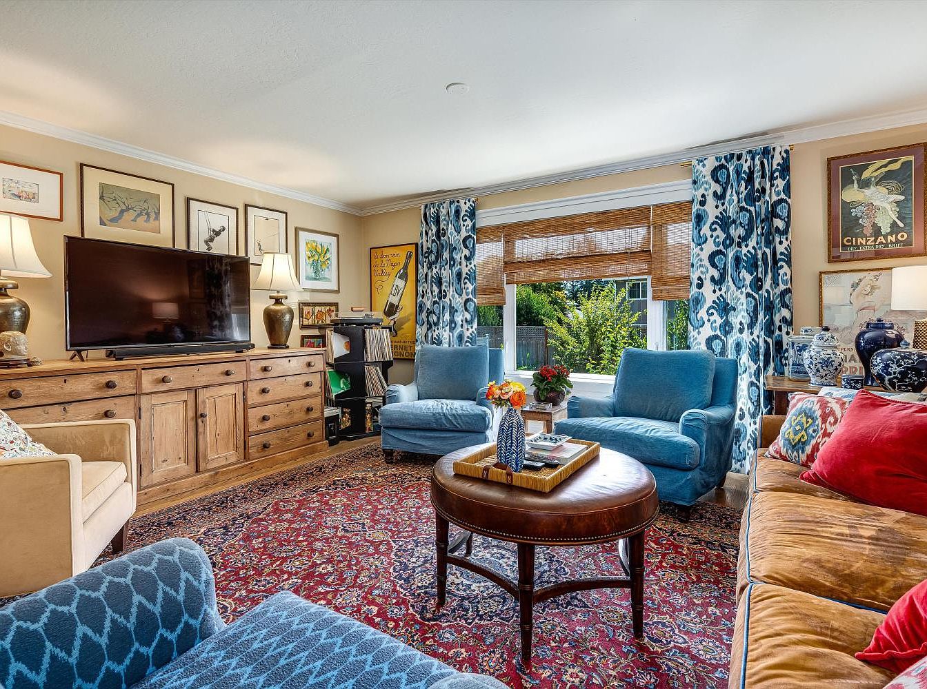 This inviting living room features a warm, rustic layout centered around a rich, patterned area rug that adds a touch of elegance. A blend of soft, muted tones and vibrant accents creates a friendly atmosphere, perfect for family gatherings. The deep blue seating contrasts beautifully with the warm wood tones of the sideboard and coffee table, enhancing the room’s charm. Artwork adorns the walls, reflecting personal touches that lend character. Large windows, adorned with stylish bamboo shades and floral curtains, invite natural light and offer glimpses of the lush outdoors, creating a seamless connection with nature.