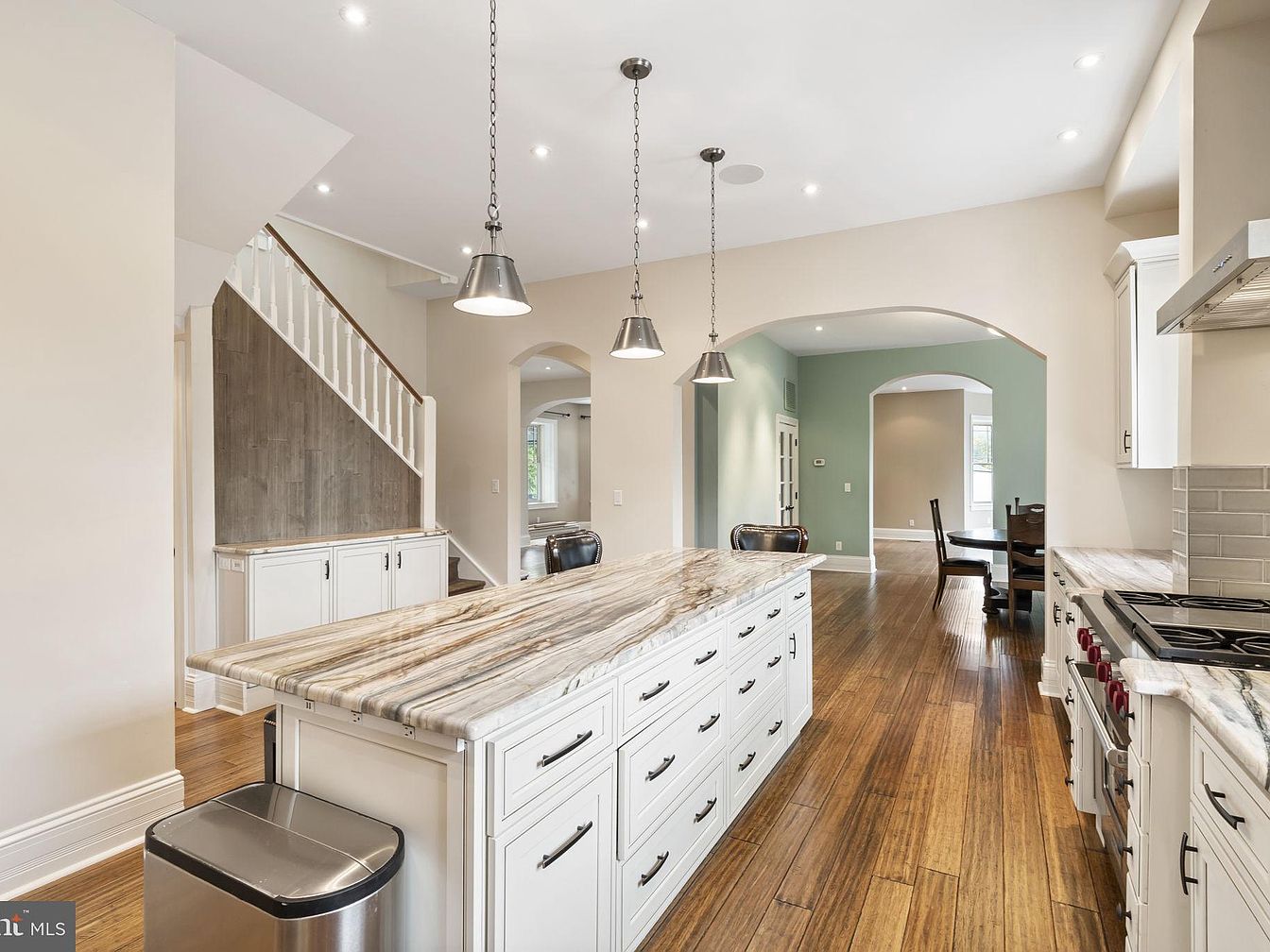 A spacious kitchen features a prominent marble-topped island with ample cabinetry, ideal for family gatherings and meal preparation. Pendant lighting creates a warm, inviting atmosphere over the central workspace, while sleek stainless steel appliances and classic white cabinets add to the modern yet timeless design. The open layout seamlessly connects the kitchen to the adjacent dining nook, making it easy for families to interact and spend time together. Natural wood flooring adds warmth and continuity throughout the space, while soft neutral walls paired with a subtle sage accent wall in the dining area bring a sense of calm and cohesion.