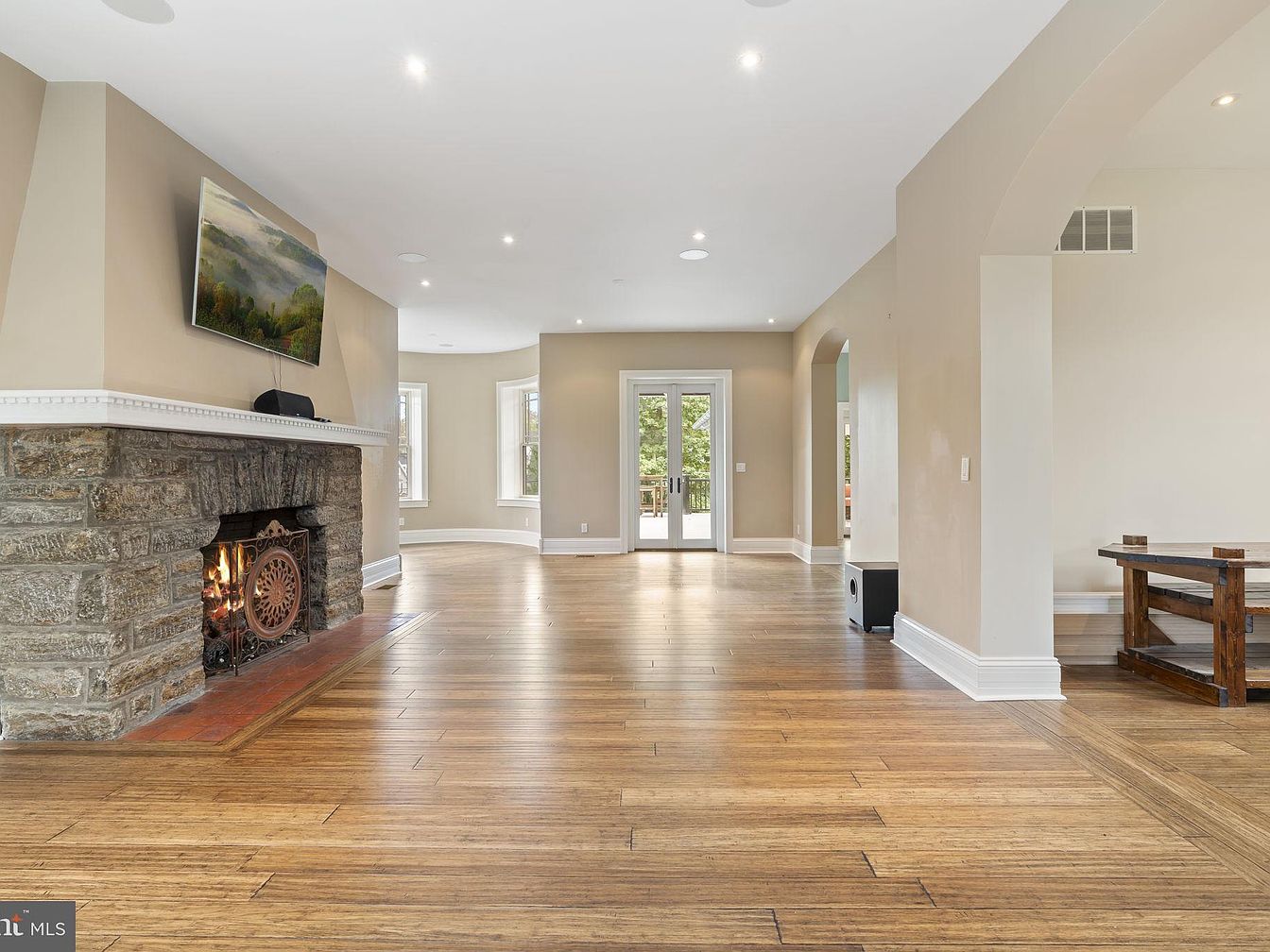 A spacious living area with luxurious hardwood floors and warm neutral walls, this room boasts an inviting stone fireplace as its focal point. The fireplace’s rustic texture adds character, crowned by an elegant mantle topped with a flat-screen TV for modern comfort. Large windows flood the space with natural light, while French doors open to the outdoors, enhancing indoor-outdoor flow. Wide archways connect seamlessly to adjacent rooms, creating a family-friendly, open concept suitable for gatherings and play. Minimalist trim and a sturdy wooden dining bench set off to the side reflect a blend of traditional craftsmanship with contemporary style.