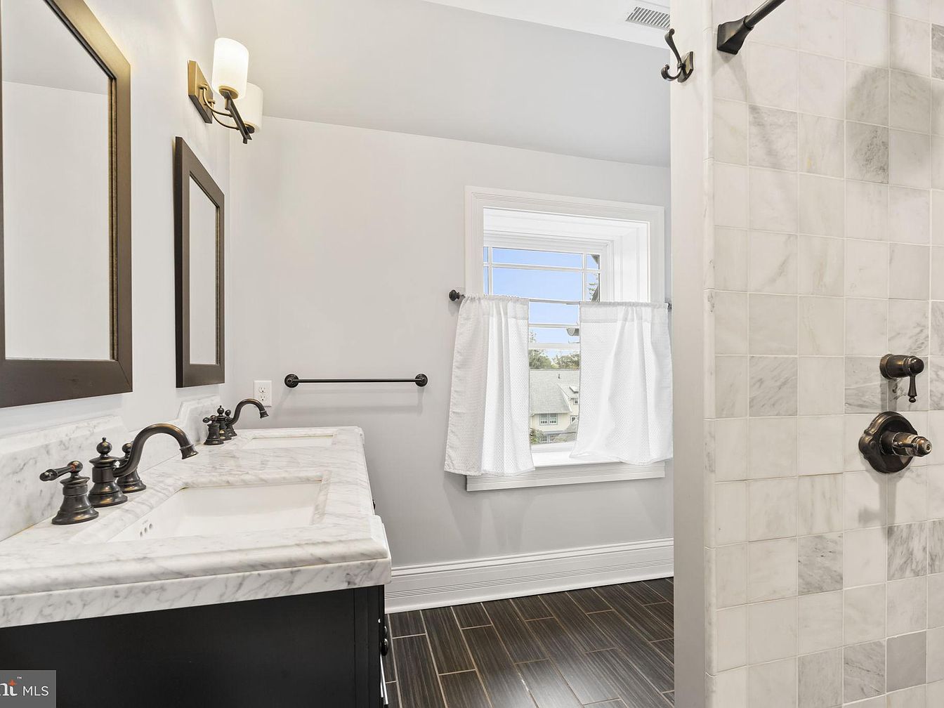 A serene bathroom showcases a spacious double vanity with elegant marble countertops and matte black fixtures, offering ample space for family members. The classic black-framed mirrors and modern lighting elevate the clean, bright style, while the white and grey palette creates a sense of tranquility. Warm wooden floor tiles add contrast and complement the soft tones of the vanity and shower. The walk-in shower, accented with large marble tiles, features sleek fixtures and easy access, making it child-friendly and practical. A large window bathes the room in natural light, finished with charming café curtains for privacy.