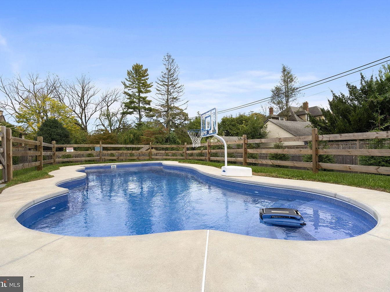 A spacious, family-friendly backyard pool features a curving, freeform design surrounded by smooth, light concrete decking for a contemporary look and easy maintenance. The inviting blue water complements the natural surroundings, while the sturdy wood fencing enhances privacy and safety, perfect for families with children. An attached basketball hoop provides hours of activity and fun, encouraging play for both kids and adults. Open skies and well-spaced landscaping create a relaxed outdoor setting ideal for gatherings or quiet relaxation. Minimalist accents and a clean aesthetic offer a welcoming atmosphere, making this pool an attractive centerpiece for a suburban home.
