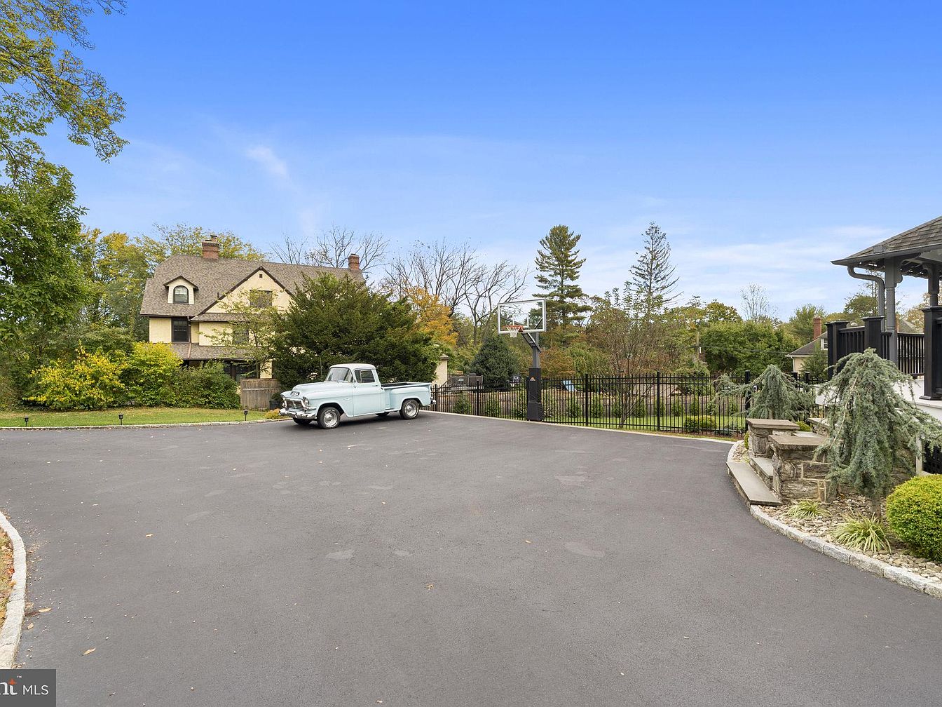 A spacious and well-paved driveway welcomes families home, providing ample space for parking and outdoor play. This area features a classic vintage truck parked at the edge, offering a touch of Americana charm against the backdrop of mature trees and lush gardens. The entrance is bordered by elegant stonework and manicured shrubs, while a sturdy black fence encloses the property, ensuring safety for children and pets. A basketball hoop enhances the family-friendly vibe, perfect for recreational activities. The driveway seamlessly connects to the main home, blending convenience, security, and classic suburban aesthetics.