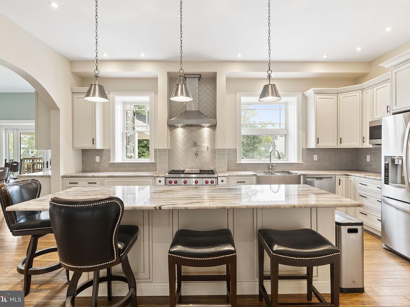 A spacious, inviting kitchen with a large marble island at the center, perfect for family gatherings and casual meals. Three cushioned leather barstools with nailhead trim provide comfortable seating, making it an ideal spot for kids to do homework or for guests to chat with the cook. Cream-colored cabinetry and sleek stainless steel appliances create a balanced blend of classic and modern aesthetics. Natural light floods the space through twin windows above the sink and cooktop, while chic pendant lights and soft recessed lighting enhance the bright, airy feel. Light gray subway tile backsplash adds understated sophistication.