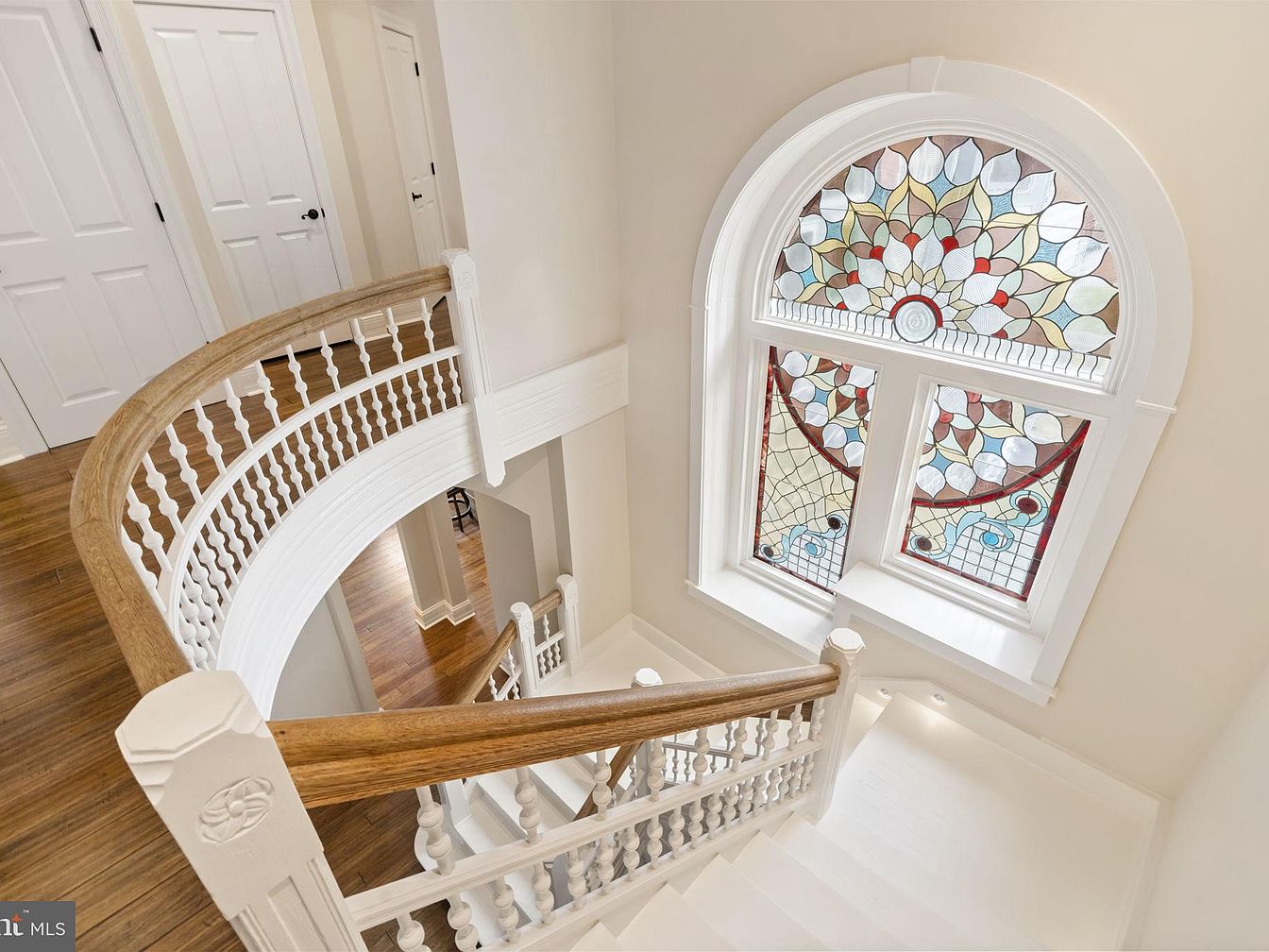 Sweeping up to the second level, this staircase landing features a stunning, large arched stained glass window, filling the area with colorful natural light and a sense of elegance. The banister blends white spindles with a warm wooden rail, complementing the rich hardwood floors throughout the upper hallway. Ample space at the landing ensures easy movement for families while offering charm and safety with sturdy, decorative railings. Crisp white trim, doors, and walls brighten the space, creating a welcoming transition between rooms. The unique architectural details make this space both functional and visually inspiring for everyday family living.