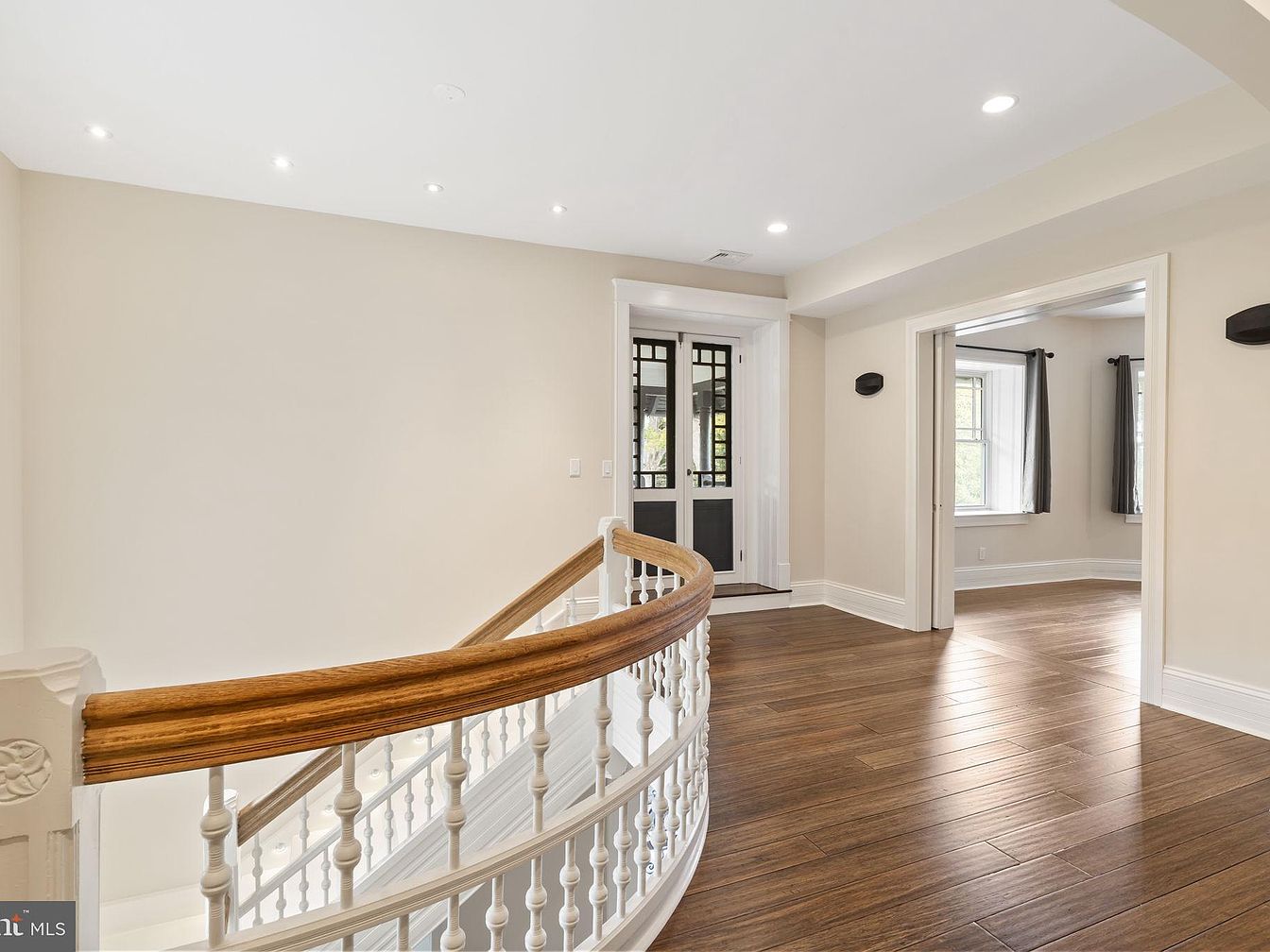 A bright and spacious upstairs landing greets you with beautiful hardwood floors and a timeless wooden banister accented by white spindles, adding both charm and safety for families with young children. The soft beige walls and recessed lighting create a warm and inviting atmosphere, while natural light streams in from large windows in the adjacent room. Crisp white trim and elegant moldings highlight the architectural details, giving the space a polished look. This open area provides easy access to surrounding rooms and could serve as a quiet reading nook or play zone, making it ideal for family living and gathering.