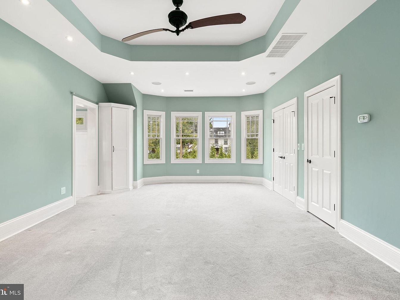 Expansive and airy, this master bedroom suite features serene sage green walls paired with plush, light gray carpeting, creating a tranquil retreat. The room is illuminated by natural light streaming through three large windows that offer backyard views, perfect for family activities. A tray ceiling with recessed lighting and a modern ceiling fan adds both architectural interest and comfort. Double closet doors provide ample storage space, while the separate alcove leads to a walk-in closet or bathroom, enhancing convenience for a busy household. The open layout and soft hues make this master suite welcoming for relaxation or family gatherings.
