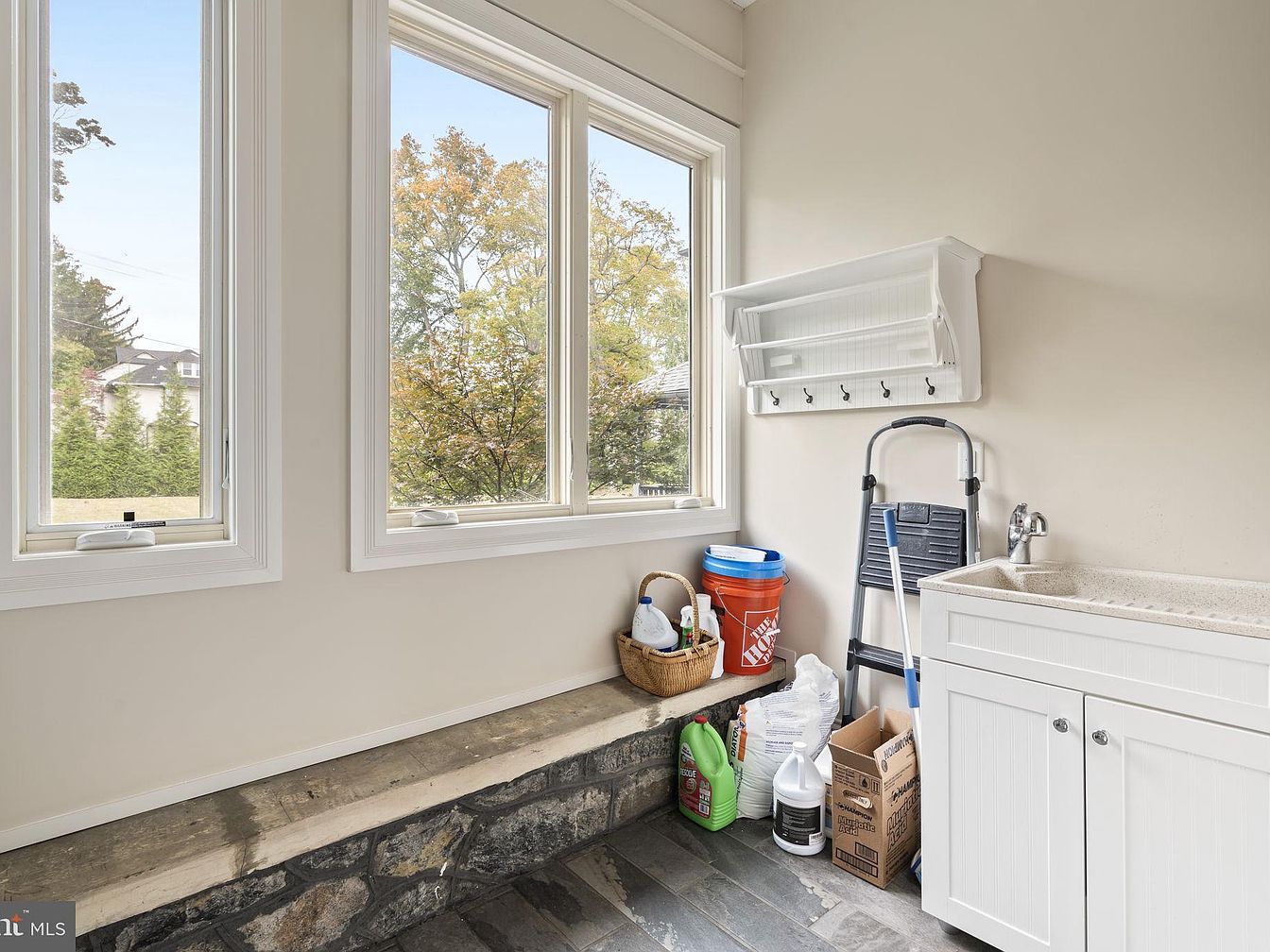 A bright laundry room corner features large windows that overlook a lush yard, filling the space with natural light and providing a cheerful environment for chores. The stone bench adds a rustic touch, offering a practical surface for sorting laundry or placing supplies. Modern cabinetry with a crisp white finish and beadboard detailing blends effortlessly with the neutral wall color. Family-friendly touches include durable tile flooring, ample open storage, and sturdy hooks perfect for organizing cleaning tools or jackets. The deep utility sink enhances functionality, making this room ideal for busy households seeking a clean, organized, and stylish utilitarian space.