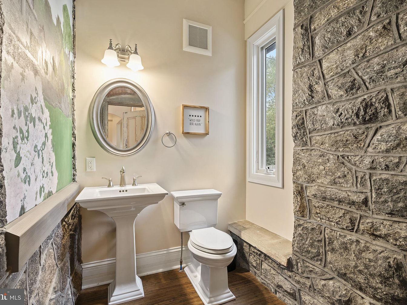 This charming powder room blends rustic stonework with timeless elegance, creating a warm and inviting space suitable for guests and family alike. The walls combine exposed, natural stone with soft beige paint, providing both a touch of history and modern comfort. A pedestal sink with classic molding sits beneath an oval-framed mirror and a brushed nickel light fixture, while a window allows ample natural daylight, making the space feel bright and welcoming. The sturdy stone ledge beneath the window offers a practical spot for extra decor or storage. Durable wood flooring and an accent wall mural add to its unique character.
