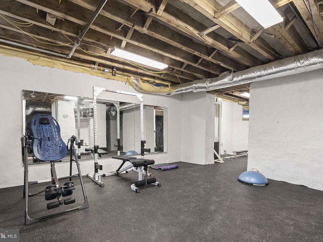This spacious basement gym features exposed wooden beams and visible ductwork for a modern industrial touch, balanced by crisp white painted walls. The black rubber flooring offers durability for active family workouts while providing a safe and cushioned surface. Large mirrors along one wall enhance the sense of space and light, making the area feel open and inviting. The gym is equipped with versatile machines and free weights, suitable for various ages and fitness levels, encouraging healthy habits for everyone in the family. Ample overhead lighting keeps the space bright, creating an energetic and motivating environment for exercise.