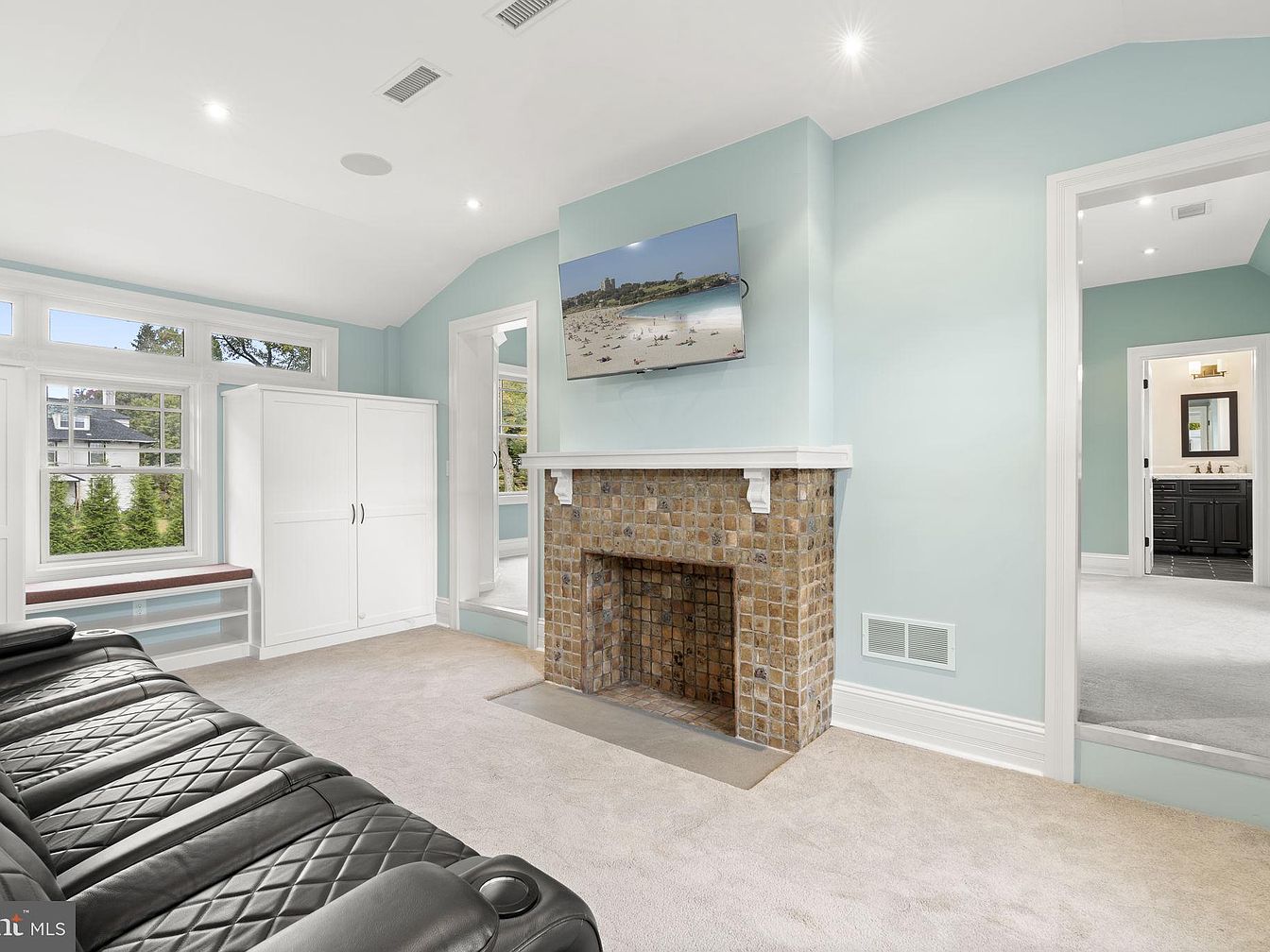 Soft blue walls and abundant natural light create a fresh, inviting atmosphere in this family room. A tiled fireplace acts as a charming focal point, topped with a wall-mounted TV perfect for movie nights or family gatherings. Light carpeting adds coziness, while a modern black leather sectional provides ample, comfortable seating for both children and adults. Built-in white cabinetry paired with a window seat offers practical storage and a sunny reading nook. High ceilings, recessed lighting, and crisp white trim enhance the airy feel, providing plenty of space for playtime, relaxation, and family activities in a welcoming environment.