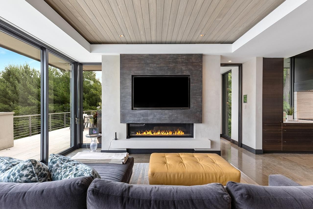 Expansive floor-to-ceiling windows create a seamless transition between the indoor living room and the lush greenery outside, bathing the space in natural light. A modern, linear fireplace beneath a sleek wall-mounted TV forms the heart of the room, complemented by a wood-paneled ceiling that adds warmth and texture. Plush seating in muted grays with patterned throw pillows invites family gatherings, while a large, tufted yellow ottoman provides a playful accent and functional surface for children’s activities. Open sightlines and access to an outdoor patio further enhance the family-friendly, airy atmosphere in this thoughtfully designed living area.