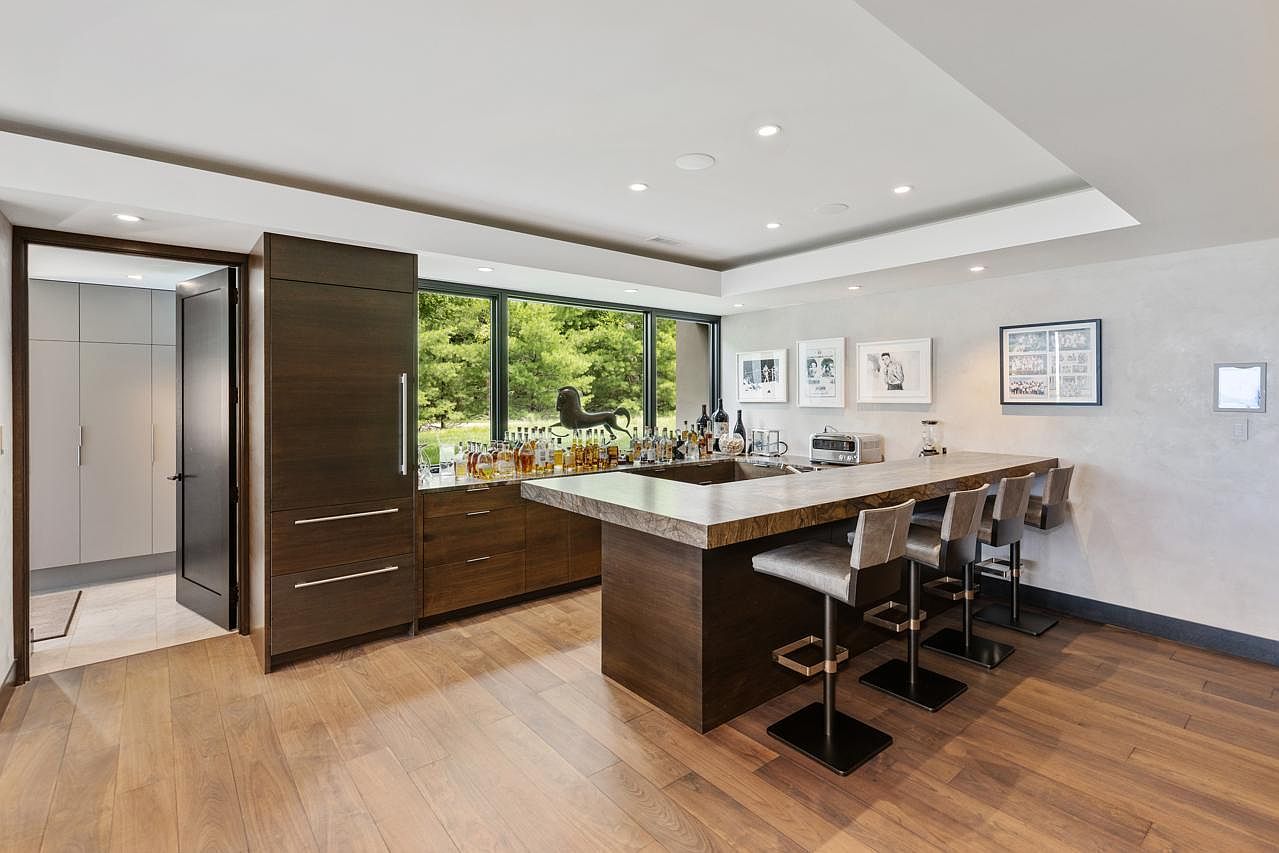 A sleek home bar area positioned by floor-to-ceiling windows that fill the space with natural light and provide a view of lush greenery. The room features a substantial waterfall-edge countertop with comfortable modern bar stools, ideal for casual gatherings and entertaining guests. Rich wood cabinetry lines the space, creating a warm and inviting ambiance, while integrated appliances and organized storage offer practicality for family life. Contemporary artwork on the textured walls adds character and visual interest, harmonizing with the neutral color palette and seamless hardwood flooring for an elegant, family-friendly social hub.