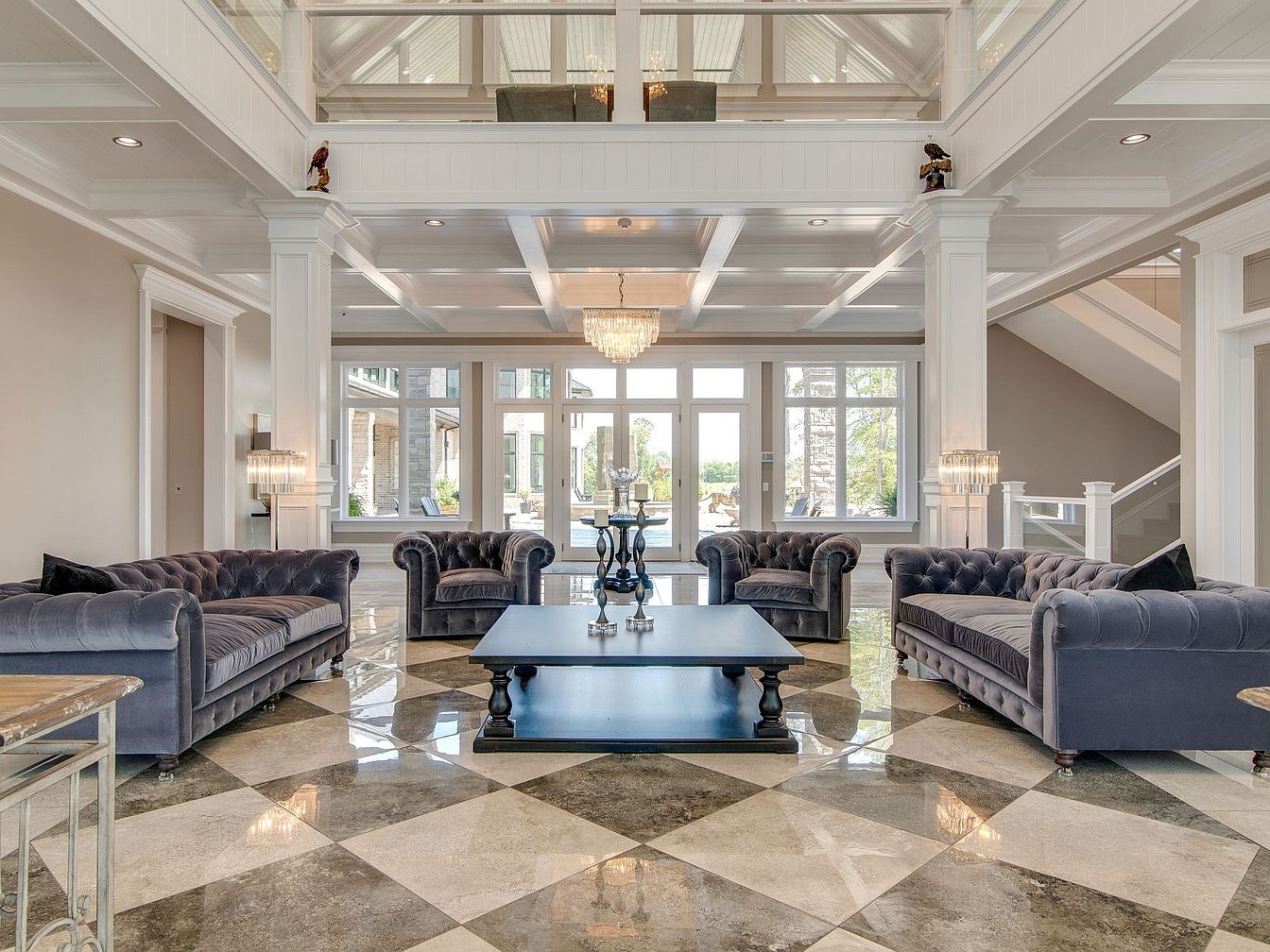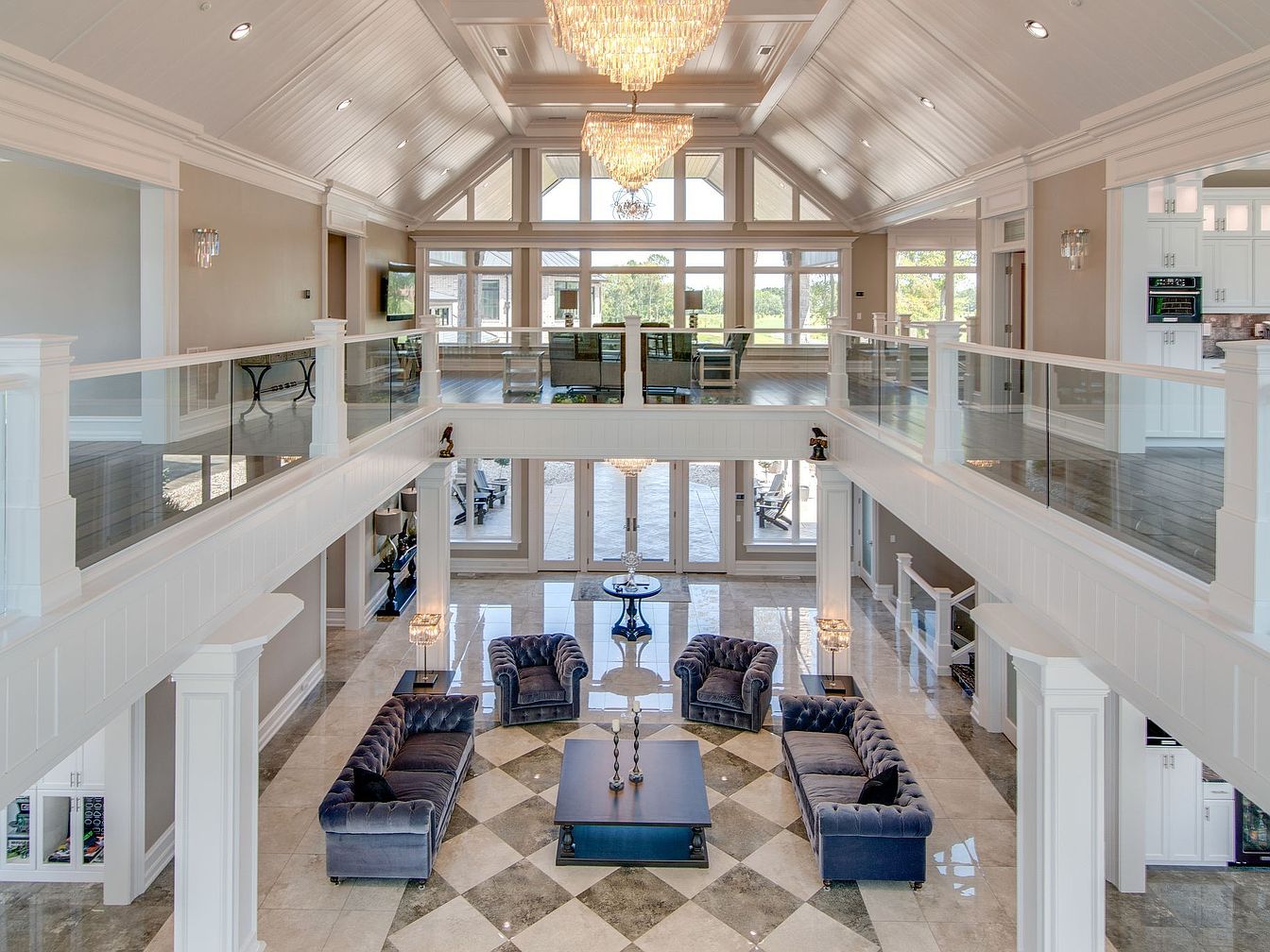 Soaring ceilings and abundant natural light define this expansive living room, highlighted by elegant chandeliers and a lofted second-floor gallery. Plush, tufted navy velvet sofas are arranged in a sociable U-shape around a sleek, minimal coffee table, perfect for family gatherings and entertaining guests. The gleaming marble floors, arranged in a diamond pattern, add a sense of luxury and spaciousness. Glass railings on the upper level ensure an open, airy feel, with clear views of both floors. Soft neutral walls and crisp white architectural woodwork create a welcoming, sophisticated environment that’s ideal for families and comfortable yet upscale living.