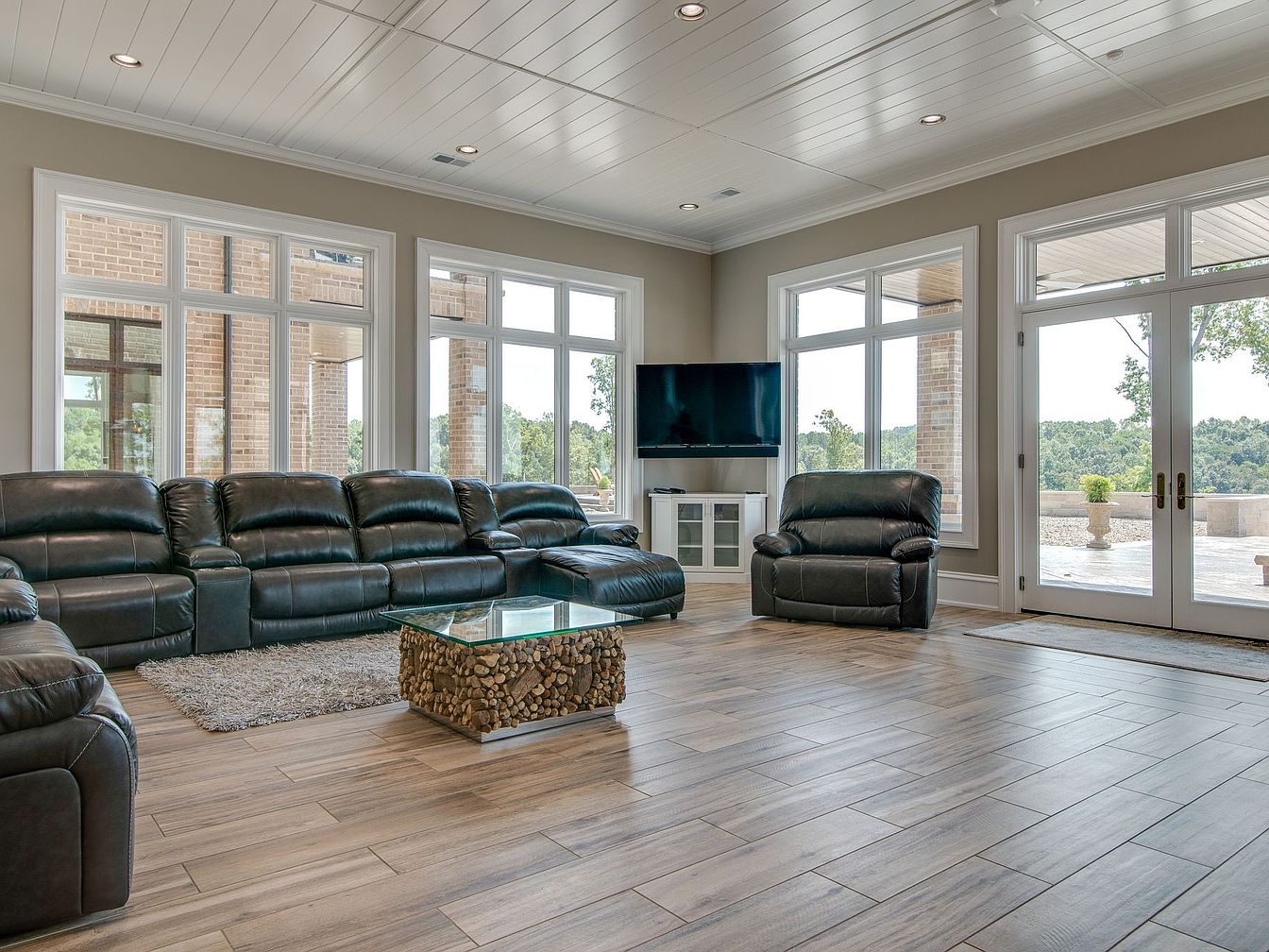 A bright and airy living room designed with family gatherings in mind features a large sectional sofa and matching recliner in sleek black leather, offering plenty of comfortable seating. The open layout is enhanced by expansive windows and glass doors that bring in natural light and provide views of the landscaped patio and greenery outside. The room showcases a neutral palette with taupe walls and wood-look floor tiles, balancing modern and rustic aesthetics. A unique coffee table with a glass top and wood base adds character while a plush area rug and wall-mounted TV invite relaxation and entertainment for all ages.