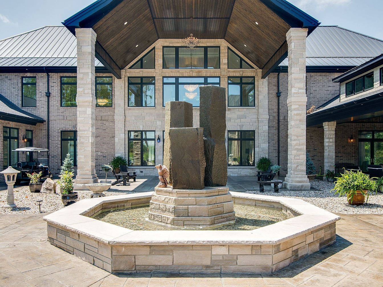 A spacious courtyard welcomes visitors with a striking modern stone fountain as its focal point, creating a serene and elegant atmosphere. Surrounded by sturdy stone pillars and a tall gabled roof, the entry is defined by architectural symmetry and clean lines. Large windows provide ample natural light and scenic views from inside, while paved walkways and thoughtfully placed greenery invite families to gather and relax outdoors. Benches and decorative pots offer comfortable seating and visual interest, blending family-friendly functionality with timeless sophistication. The soft neutral color palette, combining beige stone and light brick, enhances the inviting, harmonious ambiance.