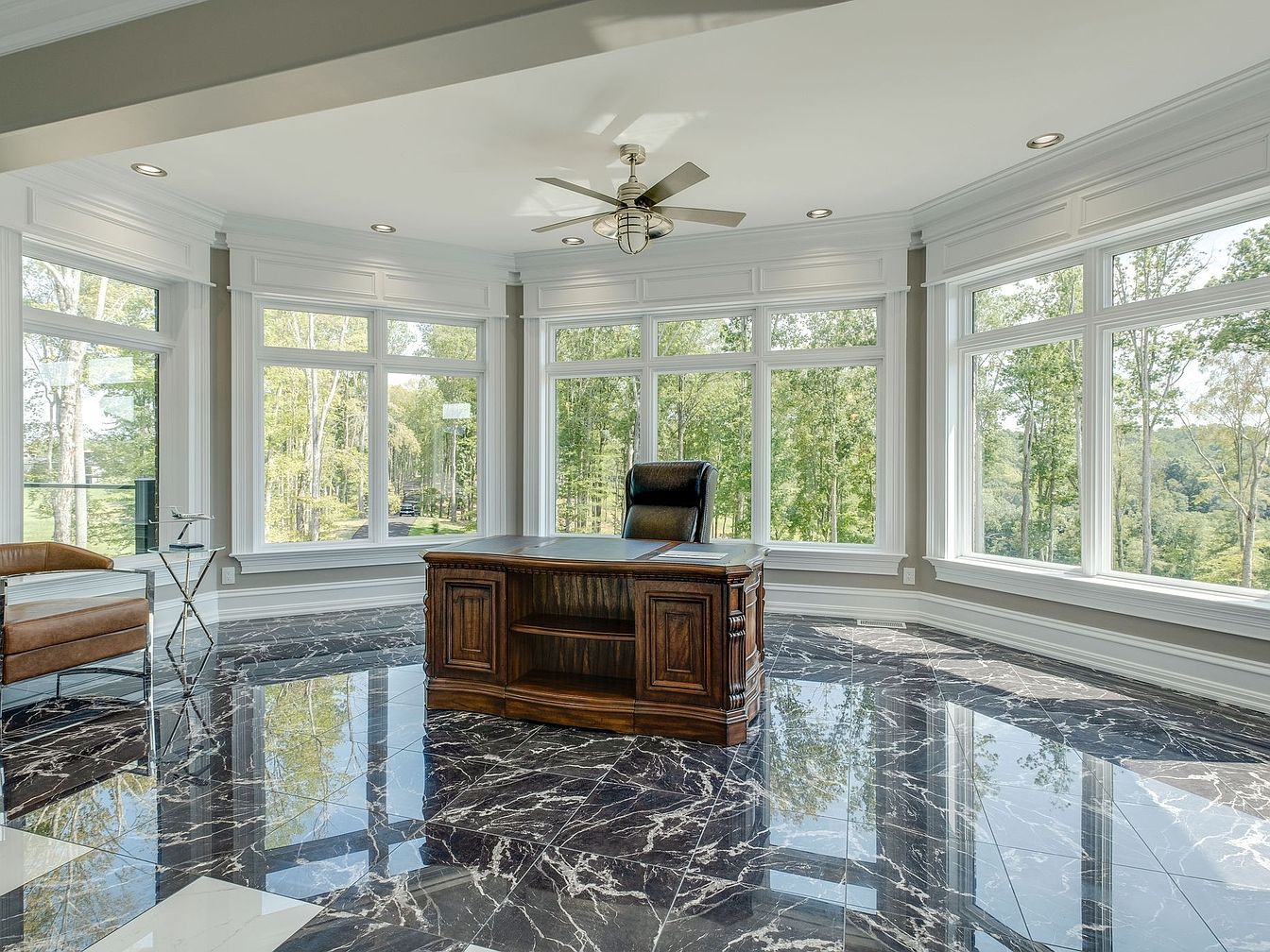 Expansive windows line the curved exterior wall, flooding the home office with natural light and offering panoramic views of lush, green woods. Polished black marble floors with striking white veining add luxury and drama, while classic white molding and trim highlight the height of the ceilings. At the room’s center stands a rich, wood executive desk paired with a high-back leather chair, suggesting both sophistication and productivity. A modern glass side table and a cognac-colored armchair create a comfortable space for reading or family visits. The neutral palette and open layout offer a calming, family-friendly environment for working from home.