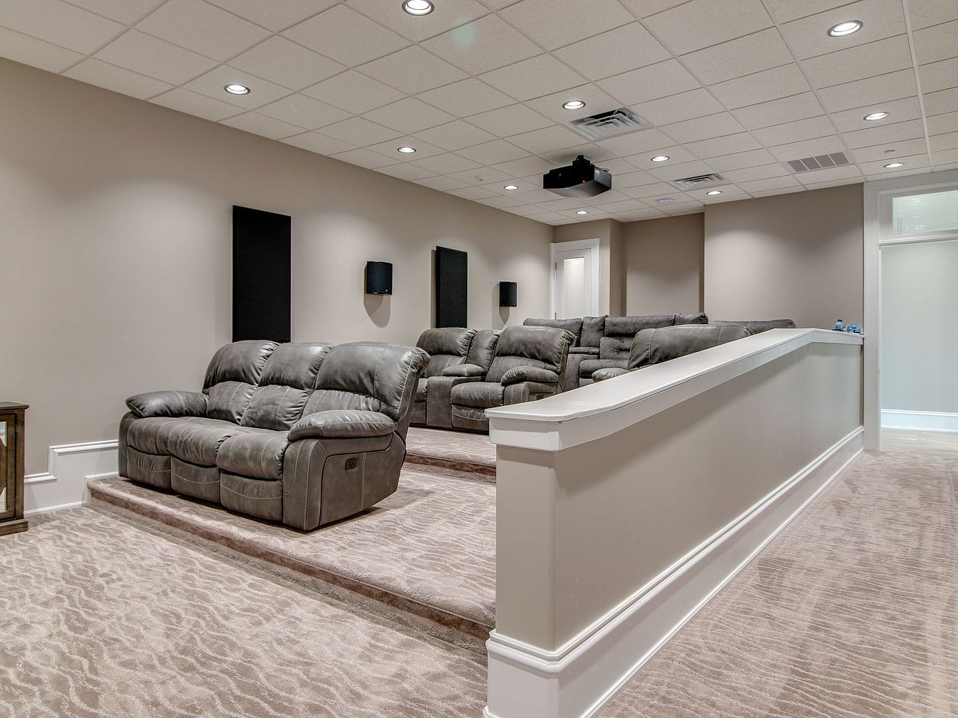A cozy, multi-tiered home theater is thoughtfully designed for ultimate comfort and family-friendly entertainment. The layout features two levels of plush, dark leather reclining seats that face a wall-mounted projector, making movie nights inviting for all ages. Soft, patterned beige carpeting and neutral-colored walls create a warm, calming atmosphere, while recessed ceiling lighting adds modern elegance. Acoustic panels on the walls ensure an immersive audio experience. Plenty of seating accommodates gatherings, and the wide, carpeted steps increase safety for children and adults alike. This inviting sanctuary is ideal for relaxed evenings with family or friends.