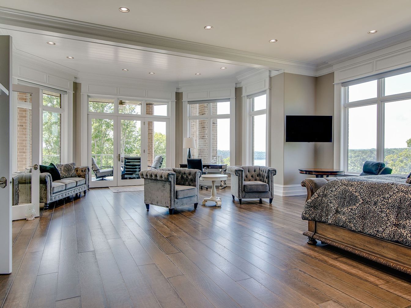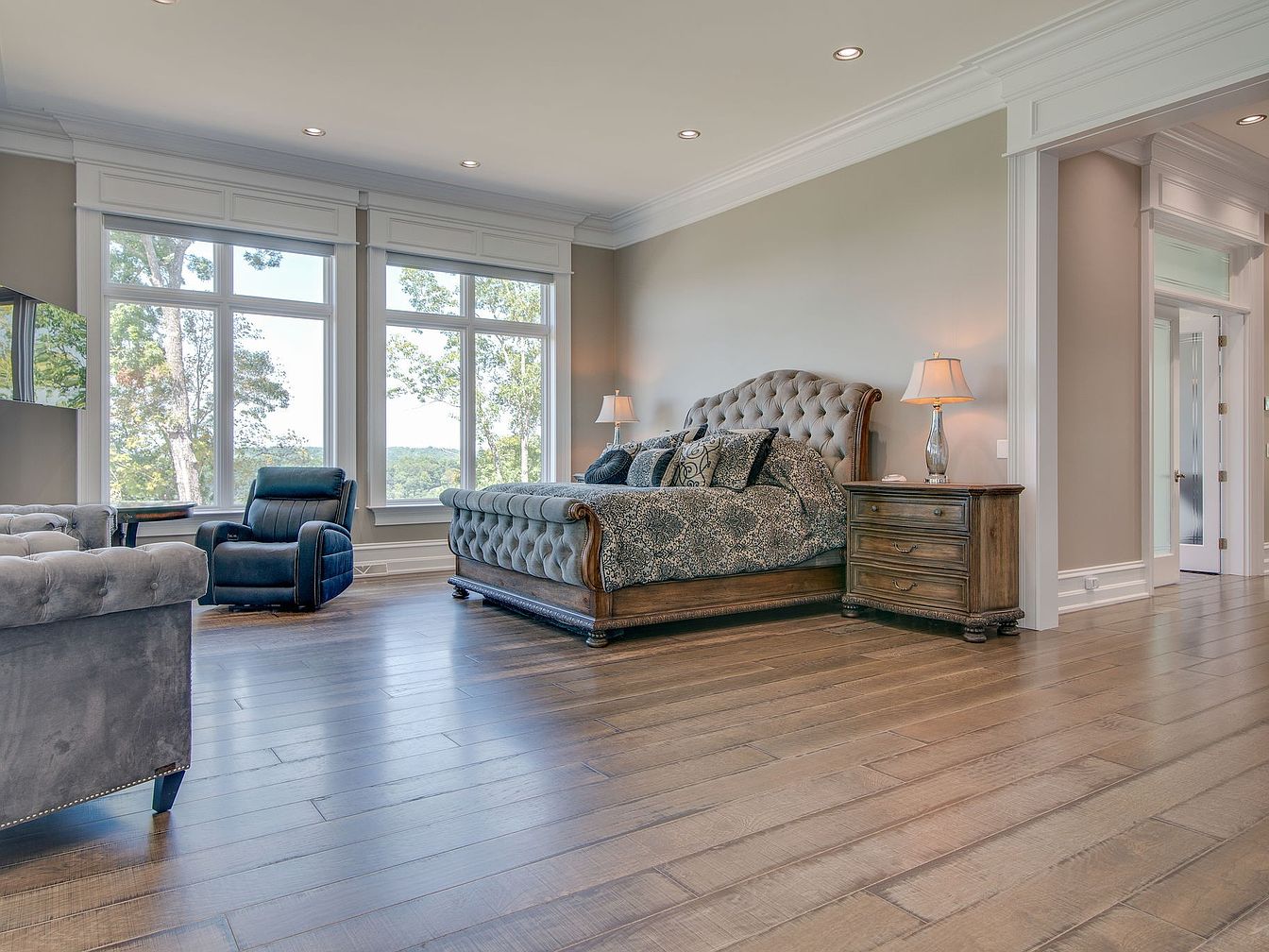 A luxurious master suite seamlessly blends relaxation and sophistication, boasting wide plank hardwood floors, neutral walls, and expansive windows that flood the space with natural light and stunning outdoor views. Plush tufted sofas and armchairs create an inviting sitting area perfect for family gatherings or quiet mornings. French doors connect to a private patio, making an excellent spot for outdoor lounging. The cozy bed, layered with rich, patterned linens, sits opposite a wall-mounted TV, providing a perfect balance of comfort and entertainment. Ample space and elegant furnishings make this room ideal for both unwinding and spending quality family time.