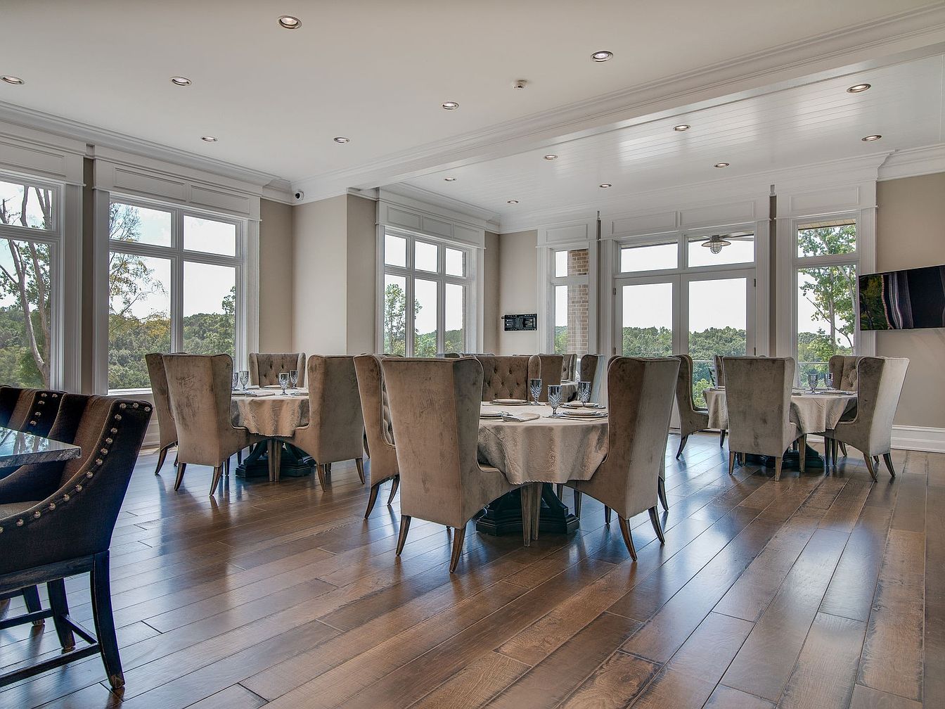Spacious dining room with large windows that flood the area with natural light and offer tranquil views of the surrounding greenery. Elegant round tables are surrounded by plush, high-backed velvet chairs, creating an inviting setting for family gatherings or entertaining guests. The room features warm wooden flooring that complements the neutral-toned walls and crisp white ceiling with recessed lighting, enhancing the airy and welcoming atmosphere. Stylish yet practical, the arrangement allows for comfortable group dining, ideal for family meals or celebrations. The layout encourages togetherness, making it a perfect spot for making memories around the table.