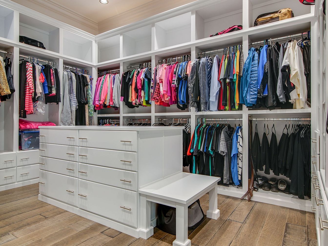 This spacious walk-in closet features custom white cabinetry and open shelving for optimal organization, offering ample storage for clothing and accessories. A large center island with numerous drawers provides additional space for folded items and smaller essentials, while a built-in bench makes dressing and shoe changes convenient for all family members. The closet is illuminated by recessed lighting, highlighting the bright, contemporary aesthetic. Elegant brushed metal hardware adds a touch of sophistication, and the light wood plank flooring creates a warm, inviting atmosphere. Thoughtful layout ensures easy access and a clutter-free space suitable for everyone’s wardrobe needs.