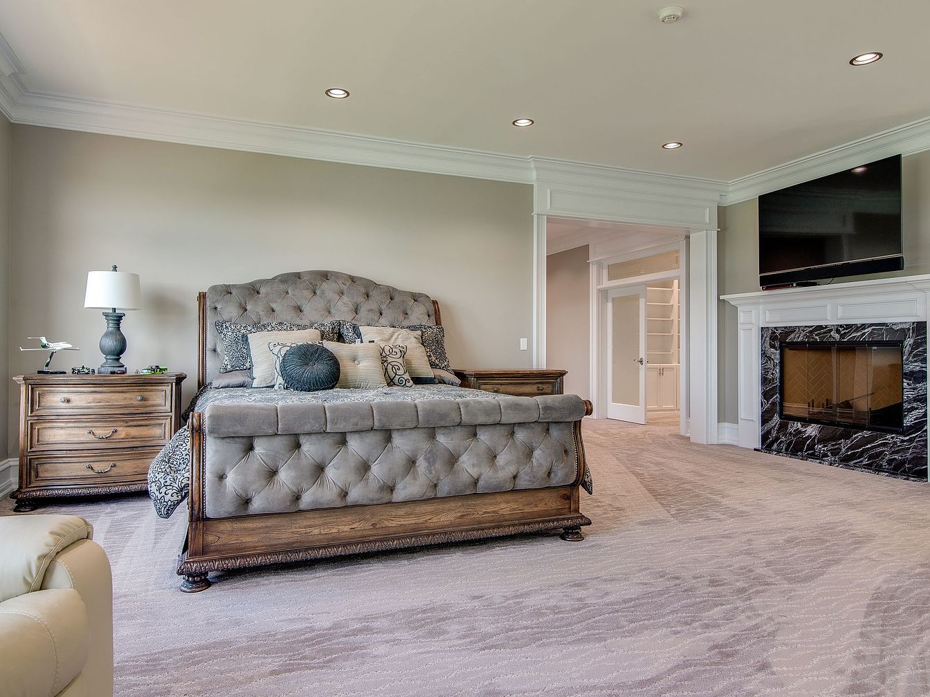 Spacious and inviting, this master bedroom showcases a luxurious tufted bed with a soft grey upholstered headboard and footboard complemented by warm wooden accents. Plush neutral carpeting adds comfort underfoot, while soft taupe walls and crisp white trim offer a serene and timeless backdrop. A cozy fireplace with black marble surround provides a stylish focal point and warmth for family evenings, with a mounted TV above for added convenience. Classic wooden nightstands and tasteful decor, including layered throw pillows and accent lighting, emphasize both comfort and sophistication. The open layout promises easy movement, making it ideal for relaxing or gathering.