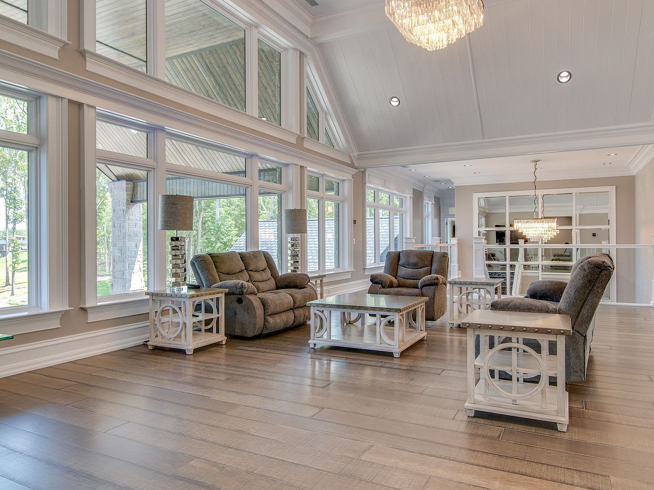 Expansive windows line the walls, flooding the living room with natural light and offering serene views of the outdoors. The space features plush, family-friendly reclining chairs and a matching sofa, arranged around a set of elegant, geometric coffee and side tables. Soft beige walls and wide-plank wood floors create a warm, inviting atmosphere, complemented by a striking chandelier and classic crown molding for a touch of sophistication. Open sight lines and ample space make this room ideal for family gatherings and entertaining, while neutral tones and refined accents ensure timeless appeal. High ceilings enhance the airy, welcoming vibe throughout.