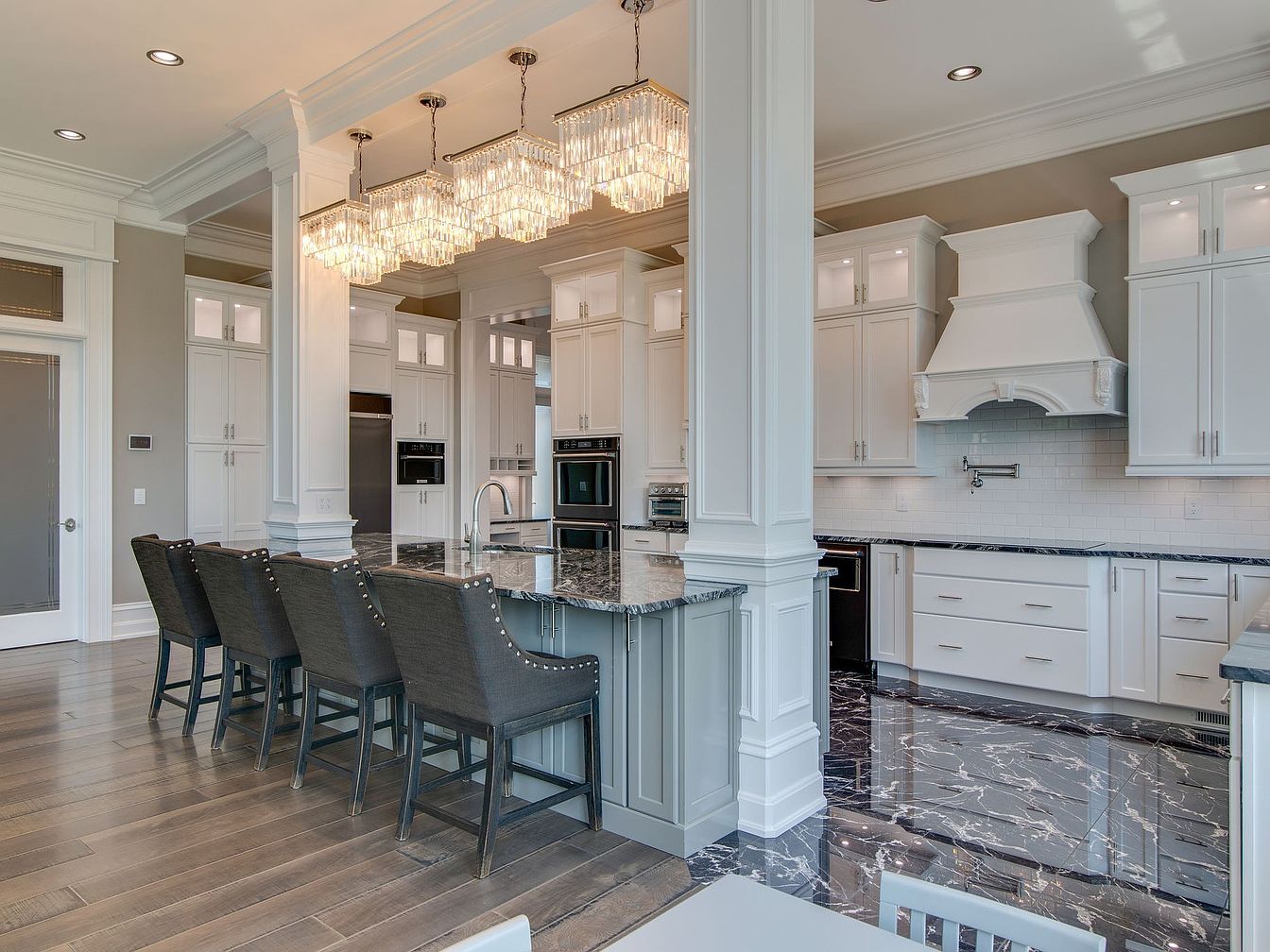 A stunning kitchen space features a large island topped with striking marble and surrounded by sleek charcoal upholstered barstools, ideal for family gatherings or casual meals. Elegant white cabinetry extends to the ceiling, offering ample storage, while crystal chandeliers provide an opulent touch and plenty of illumination. The room seamlessly blends practicality and luxury with a spacious layout, expansive counters, and a statement range hood. Subtle grey walls pair with a blend of natural wood and glossy black marble flooring, adding warmth and contrast. Thoughtful design elements accommodate a growing family and make the kitchen the heart of the home.