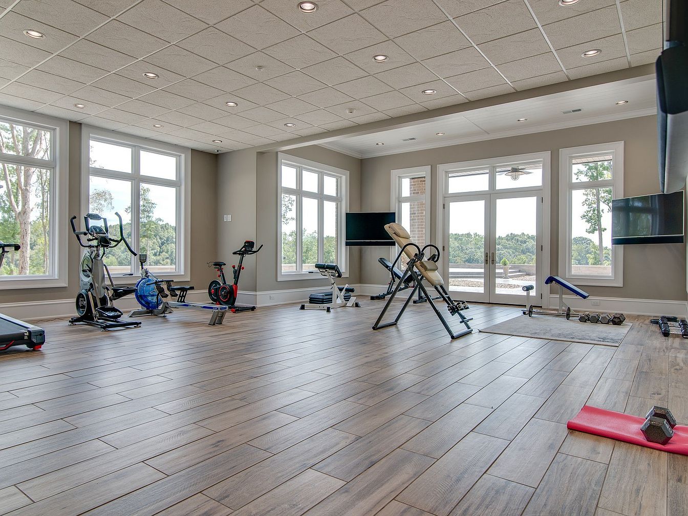 Spacious and inviting, this home gym features large windows that flood the room with natural light and offer peaceful views of the outdoors. The layout is open, allowing plenty of room for movement and group workouts, making it ideal for family fitness activities. A range of modern exercise equipment is spread out on durable wood-look tile flooring that adds warmth and easy maintenance. Neutral gray walls with crisp white trim create a calming atmosphere, while recessed lighting ensures the room stays bright even at night. Double French doors provide easy access to the outside, enhancing the connection to nature.