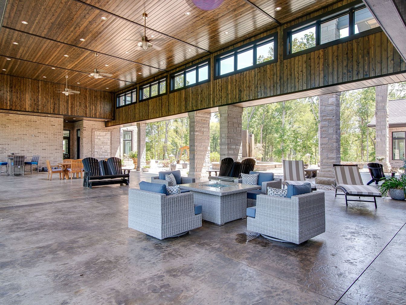 Expansive covered patio blends rustic wood ceilings and exposed brick columns with modern comforts, offering a spacious area perfect for gatherings. Multiple seating groups with cushioned wicker chairs, loungers, and dark Adirondack benches surround a central fire pit, inviting relaxation for family and friends. Neutral and blue-toned fabric contrasts with the natural textures, while high windows flood the space with natural light. Ceiling fans provide comfort for all ages and durable flooring makes the area easy to maintain. This outdoor entertaining space seamlessly connects to the landscape, ideal for both lively parties and peaceful afternoons.