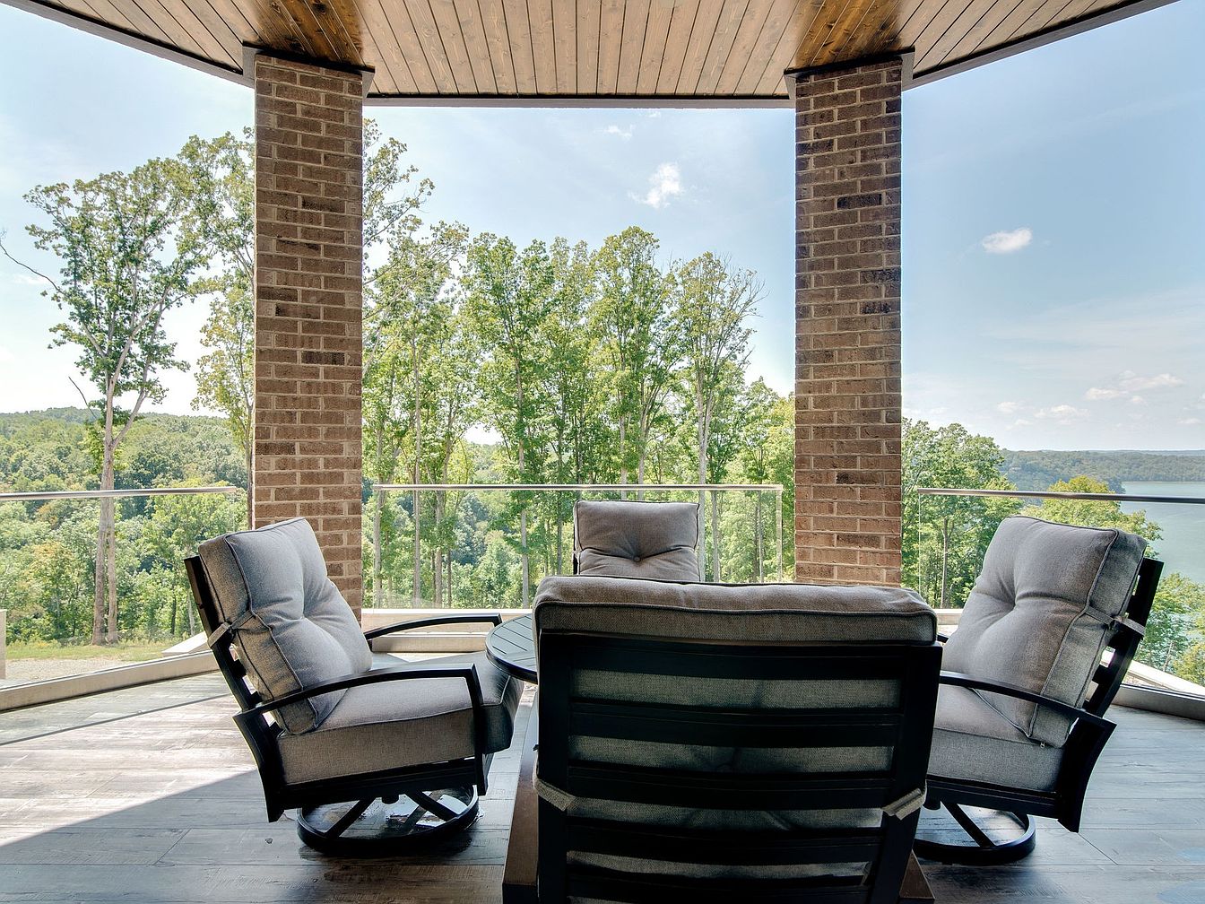 This inviting covered patio boasts an open and airy design, framed by warm brick columns and a rich wood-paneled ceiling. Comfortable cushioned swivel chairs are arranged around a stylish central table, creating a cozy spot for family conversations or morning coffee. Glass railings offer unobstructed views of the scenic forest and sparkling lake beyond, seamlessly merging indoor comfort with outdoor beauty. The soft grey tones of the furniture harmonize with the natural hues outside, making it both relaxing and sophisticated. The sturdy construction and generous seating provide a safe and family-friendly gathering space for all ages.